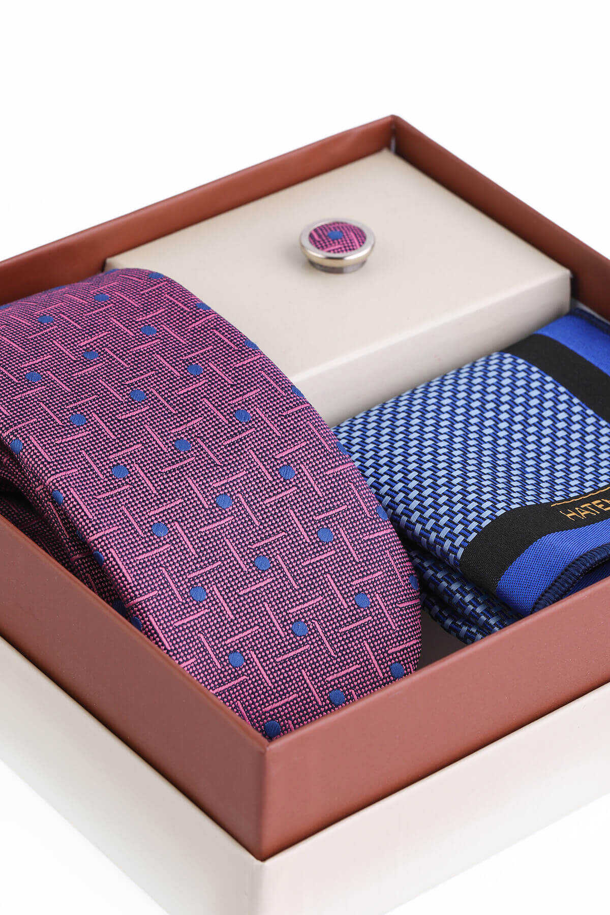 Lila Üçlü Yaka Rozeti Kravat Mendil Set