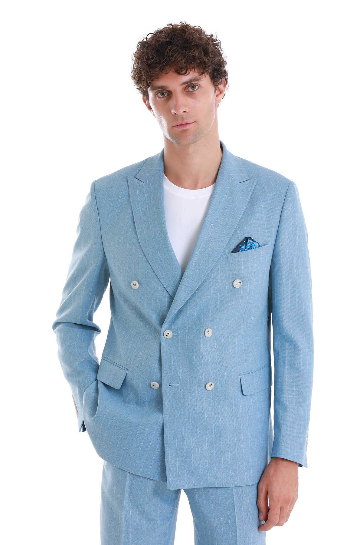 Mavi Slim Fit Çizgili Kruvaze Takım Elbise