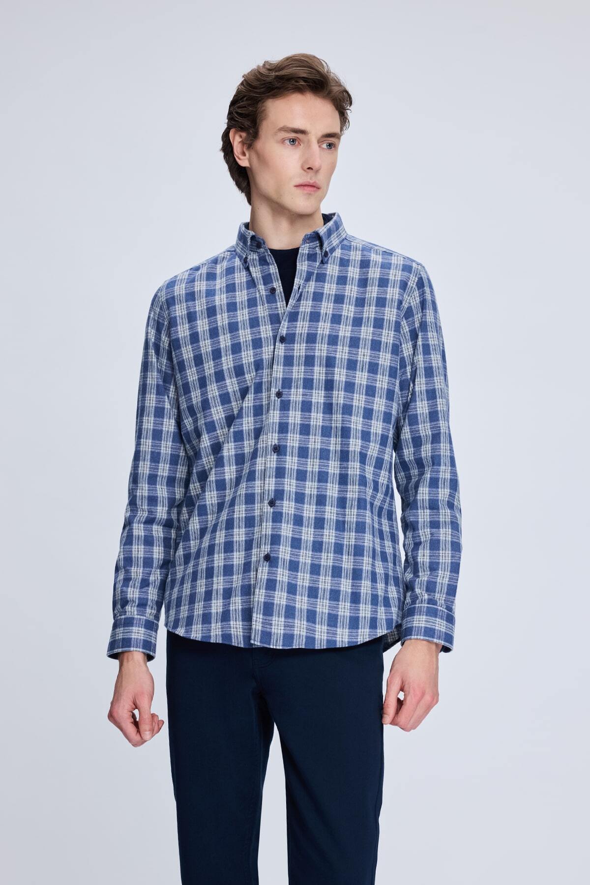 Mavi Slim Fit Kareli Düğmeli Yaka Uzun Kollu Pamuklu Gömlek