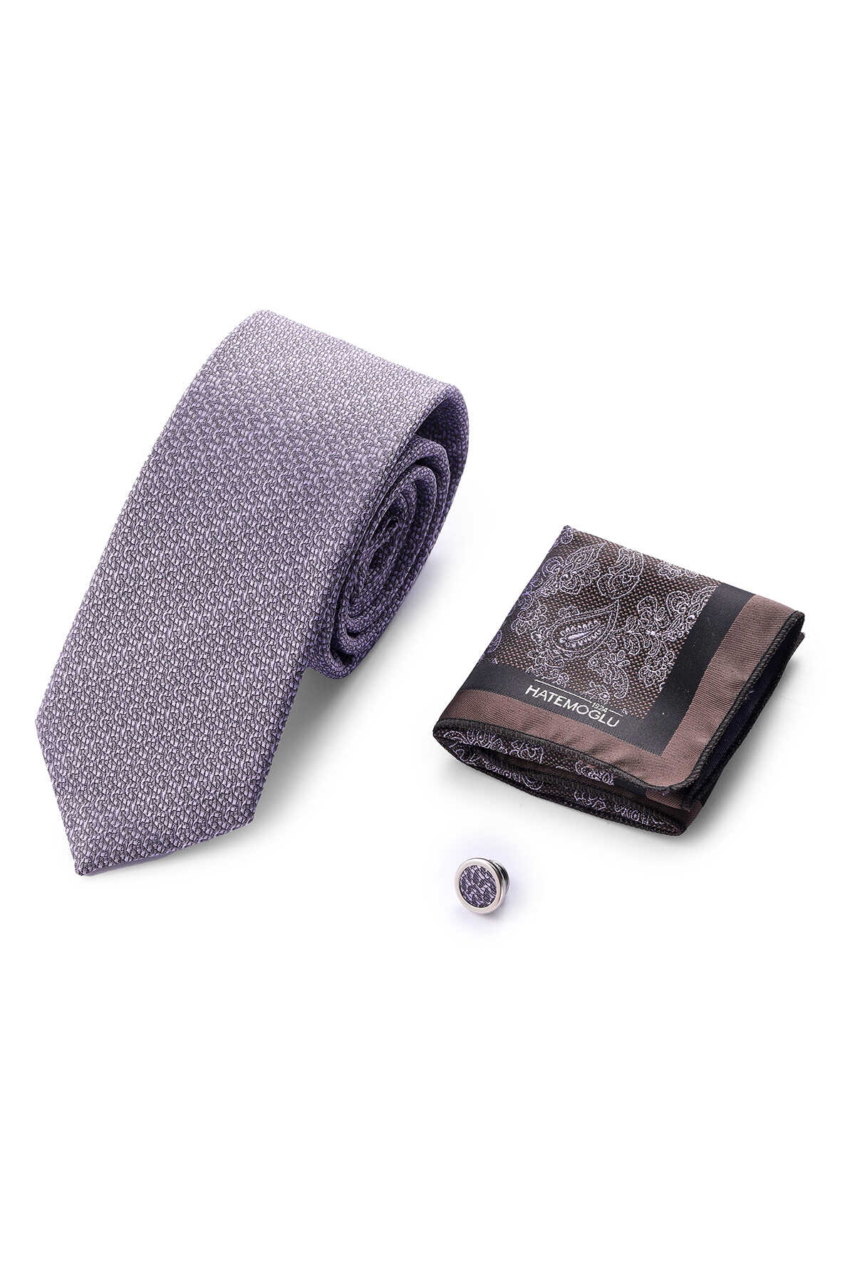 Mor Üçlü Yaka Rozeti Kravat Mendil Set