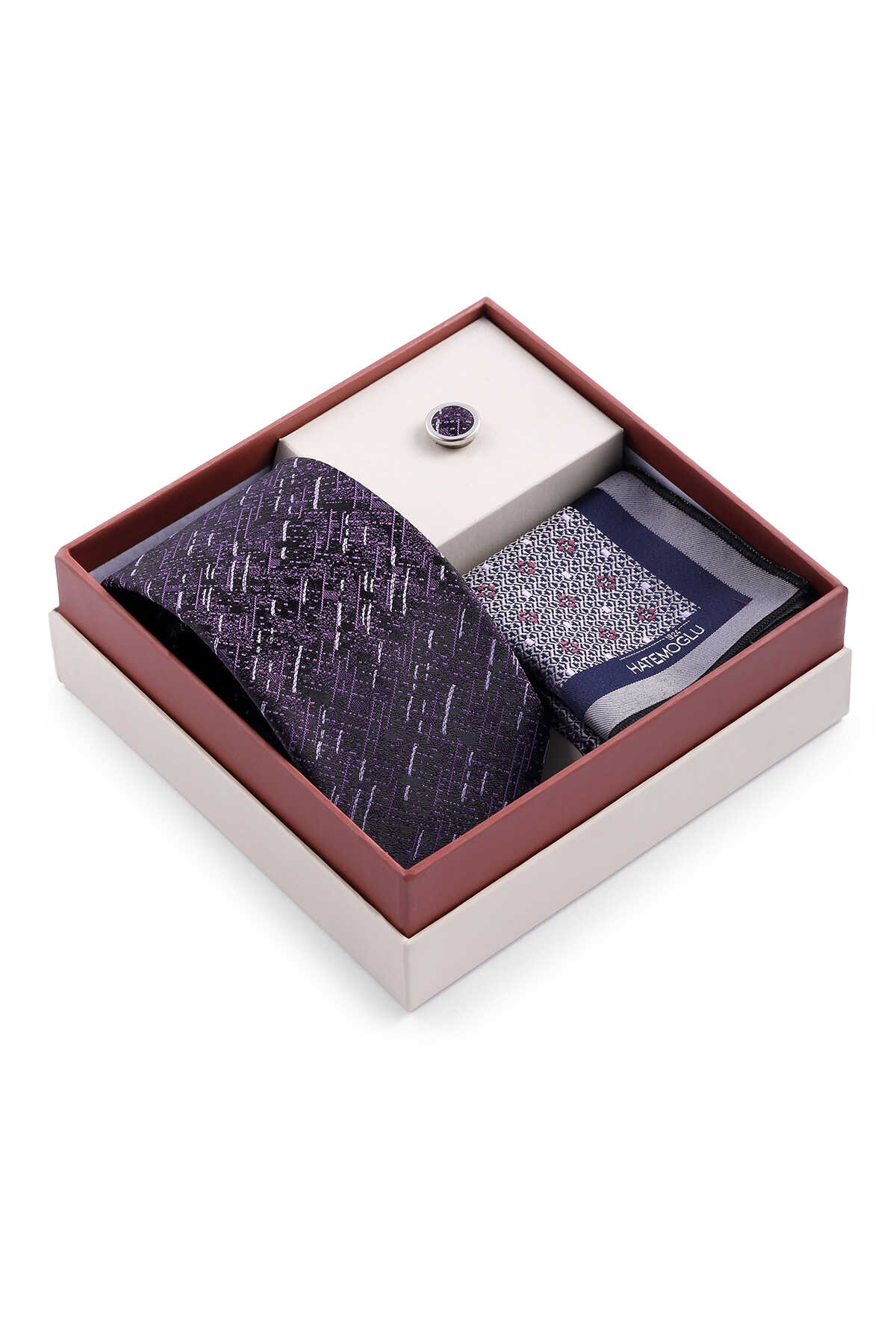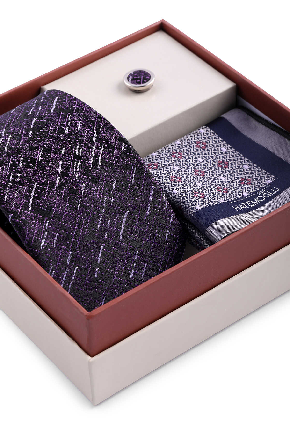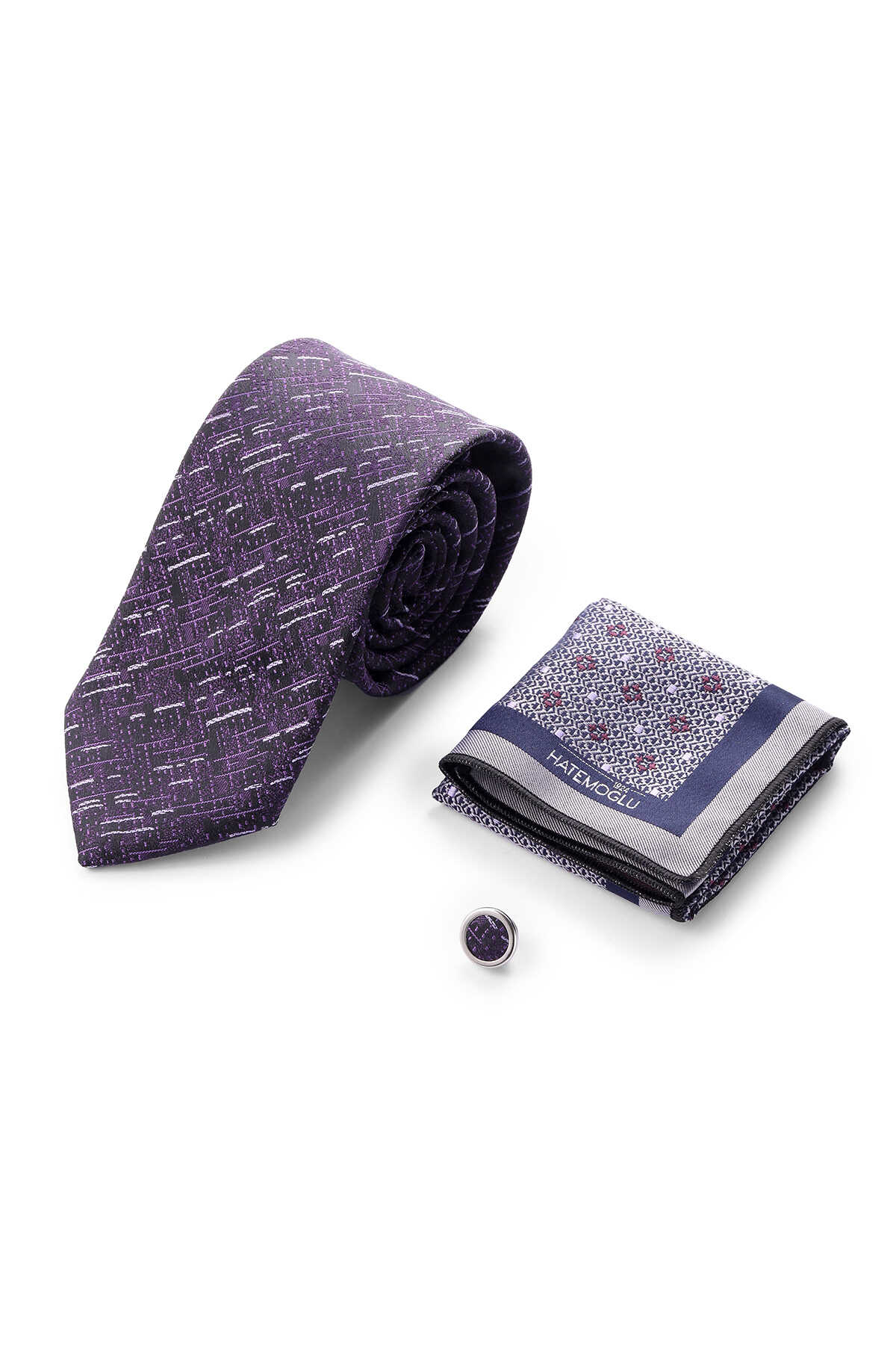 Mor Üçlü Yaka Rozeti Kravat Mendil Set