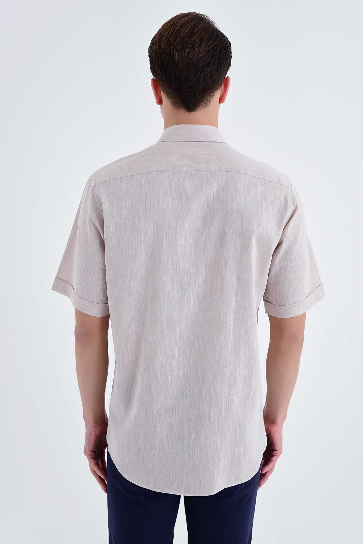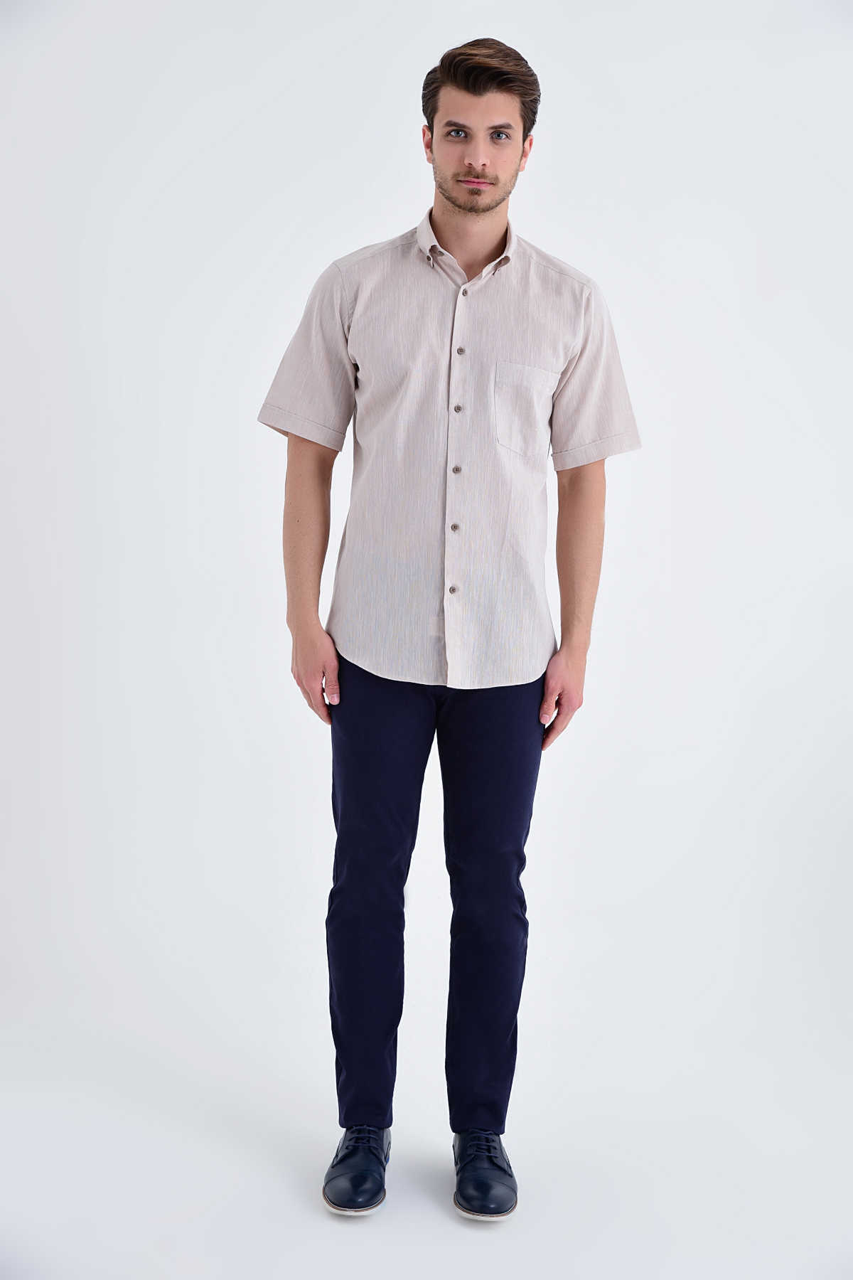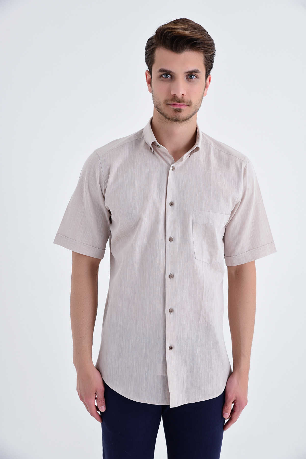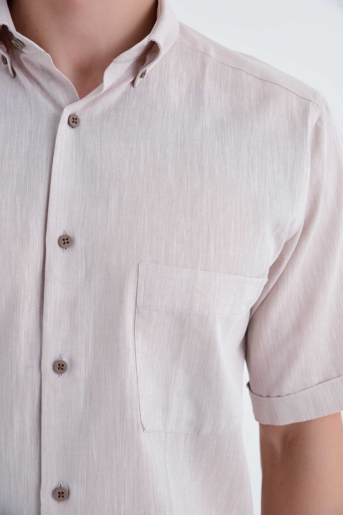 Bej Regular Fit Kısa Kol Keten Gömlek