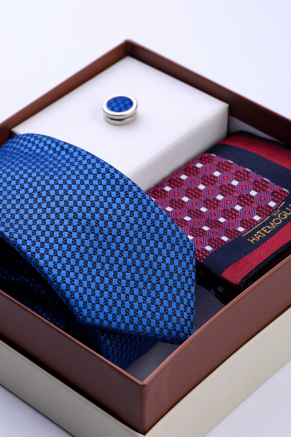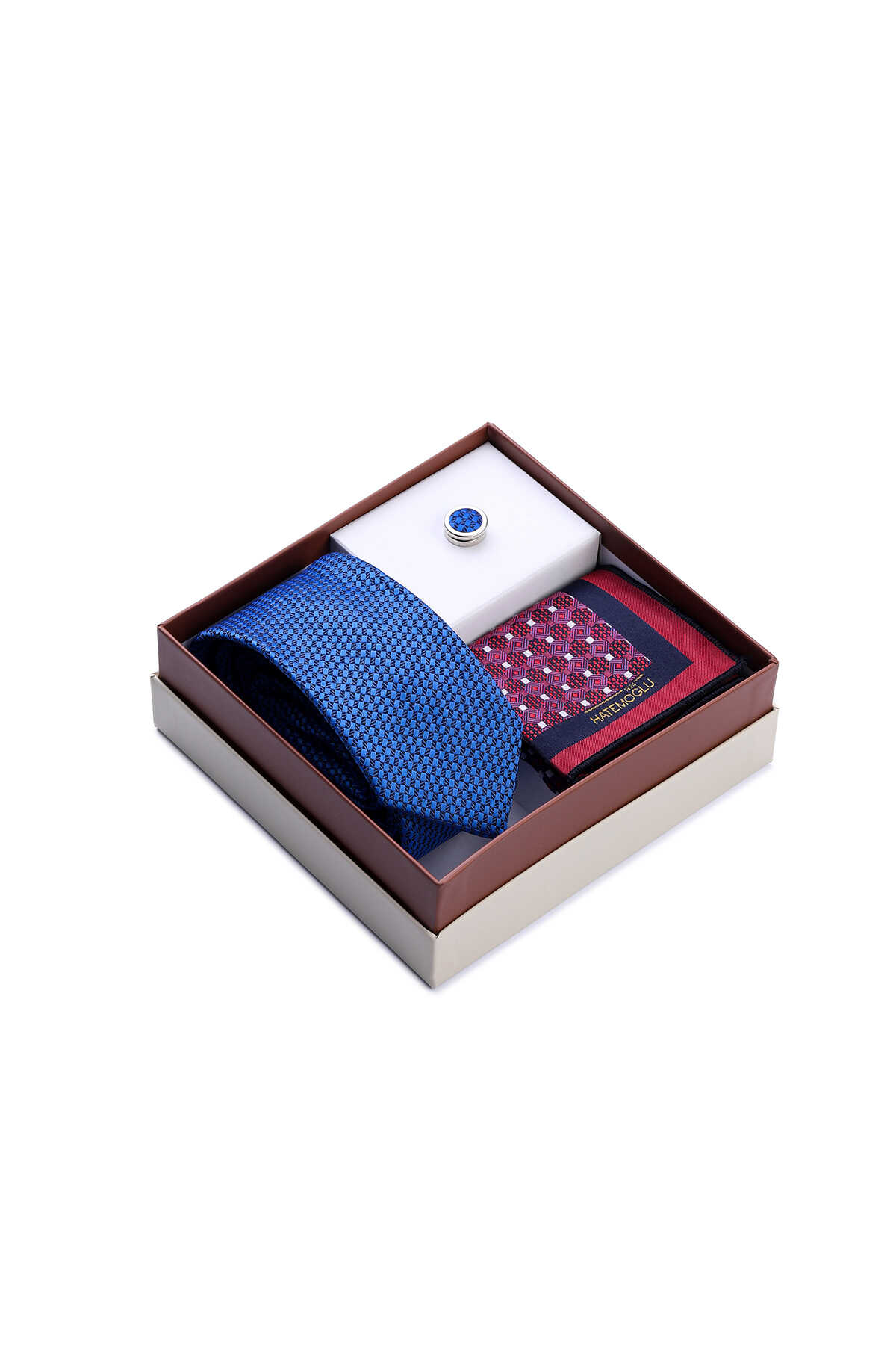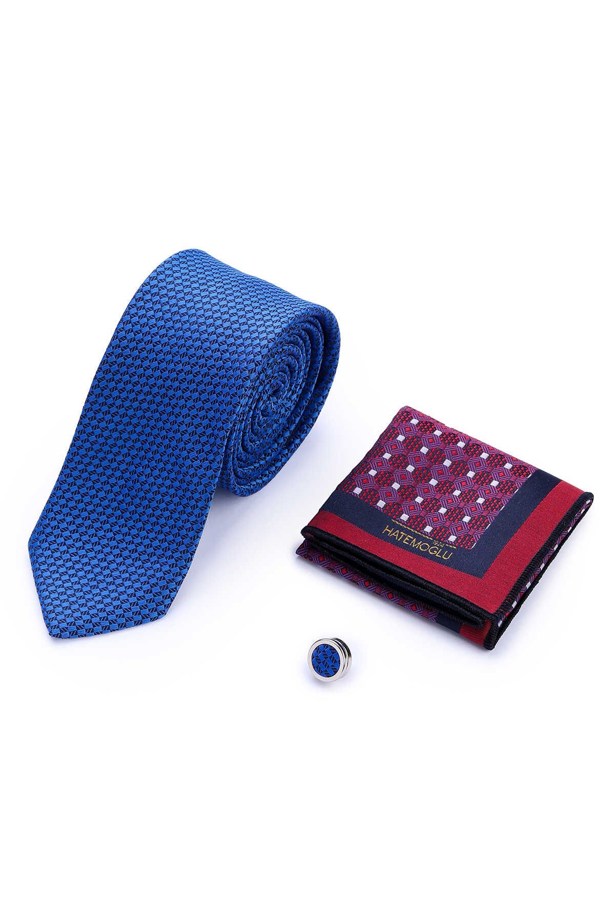 Lacivert Üçlü Yaka Rozeti Kravat Mendil Set