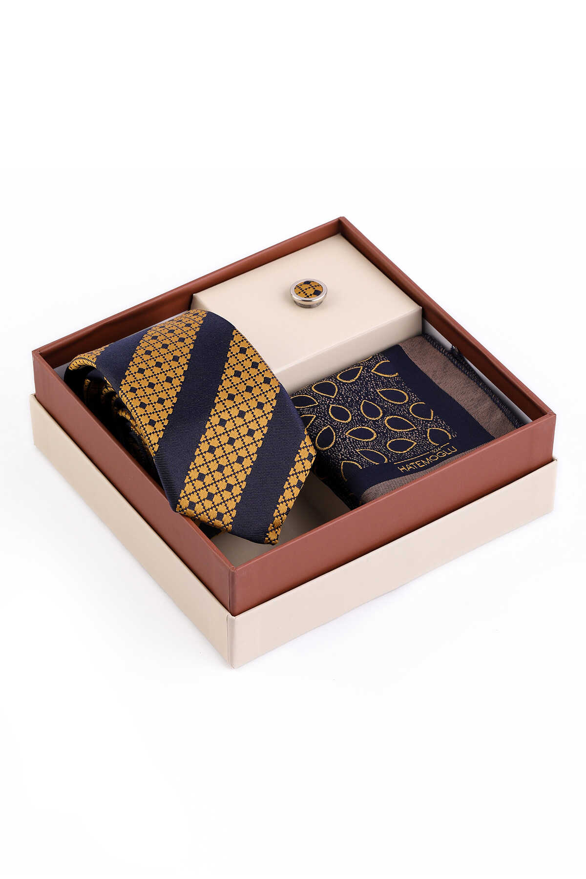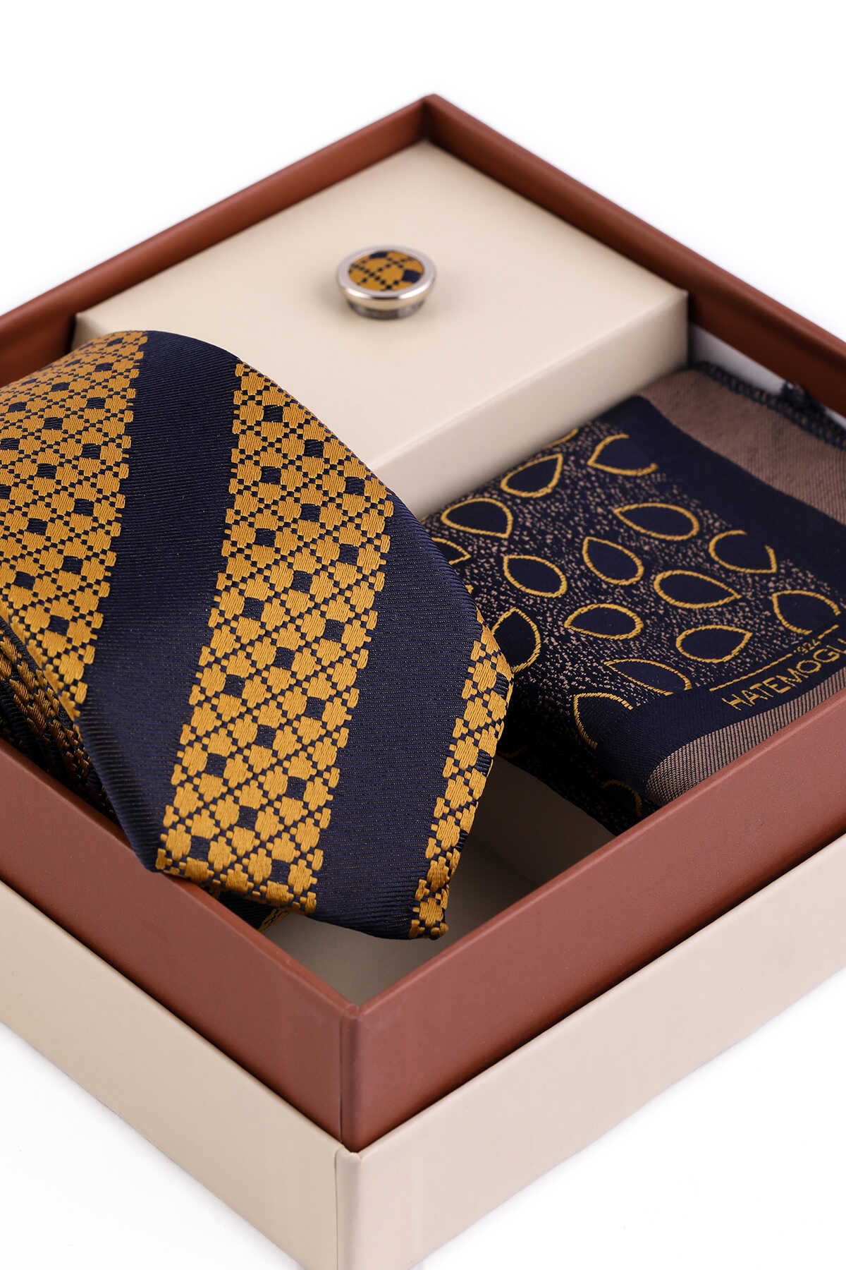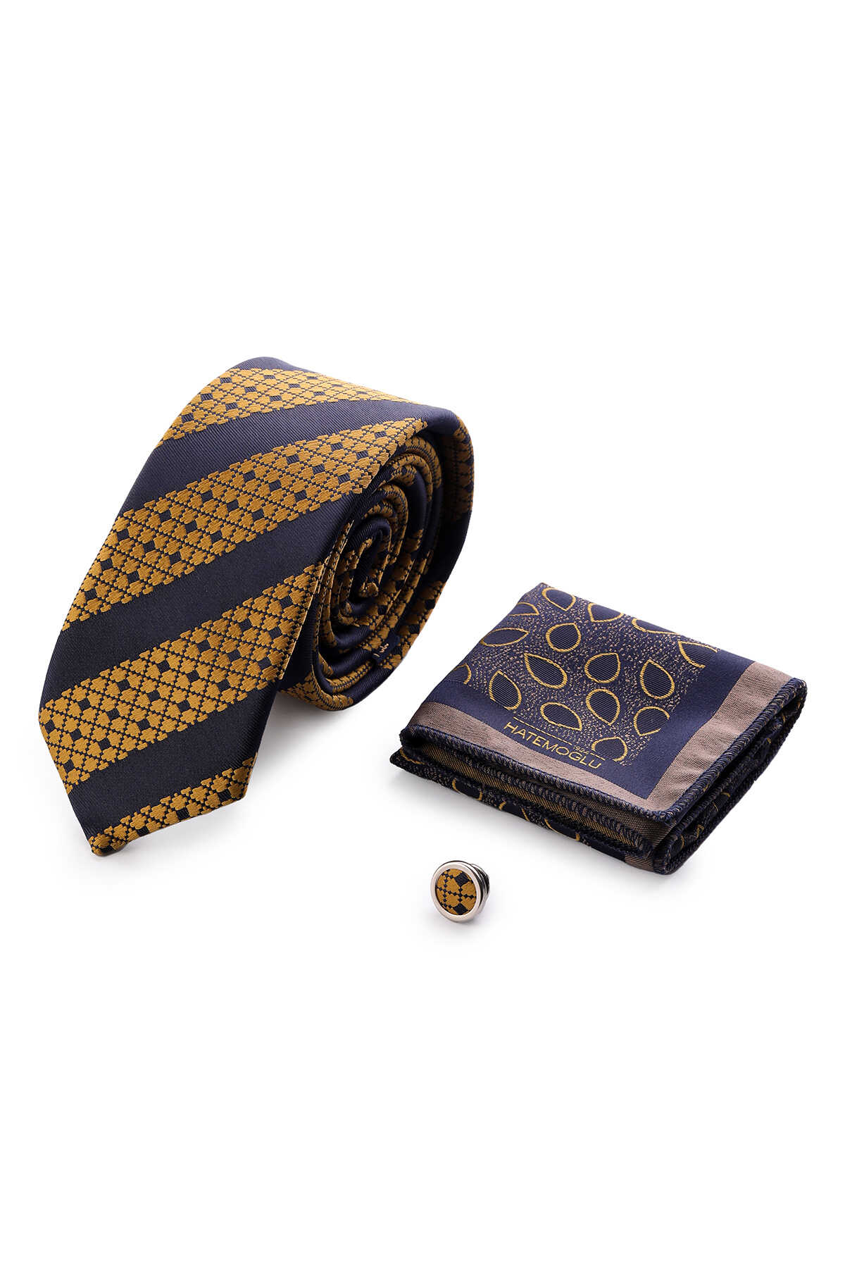 Sarı Üçlü Yaka Rozeti Kravat Mendil Set