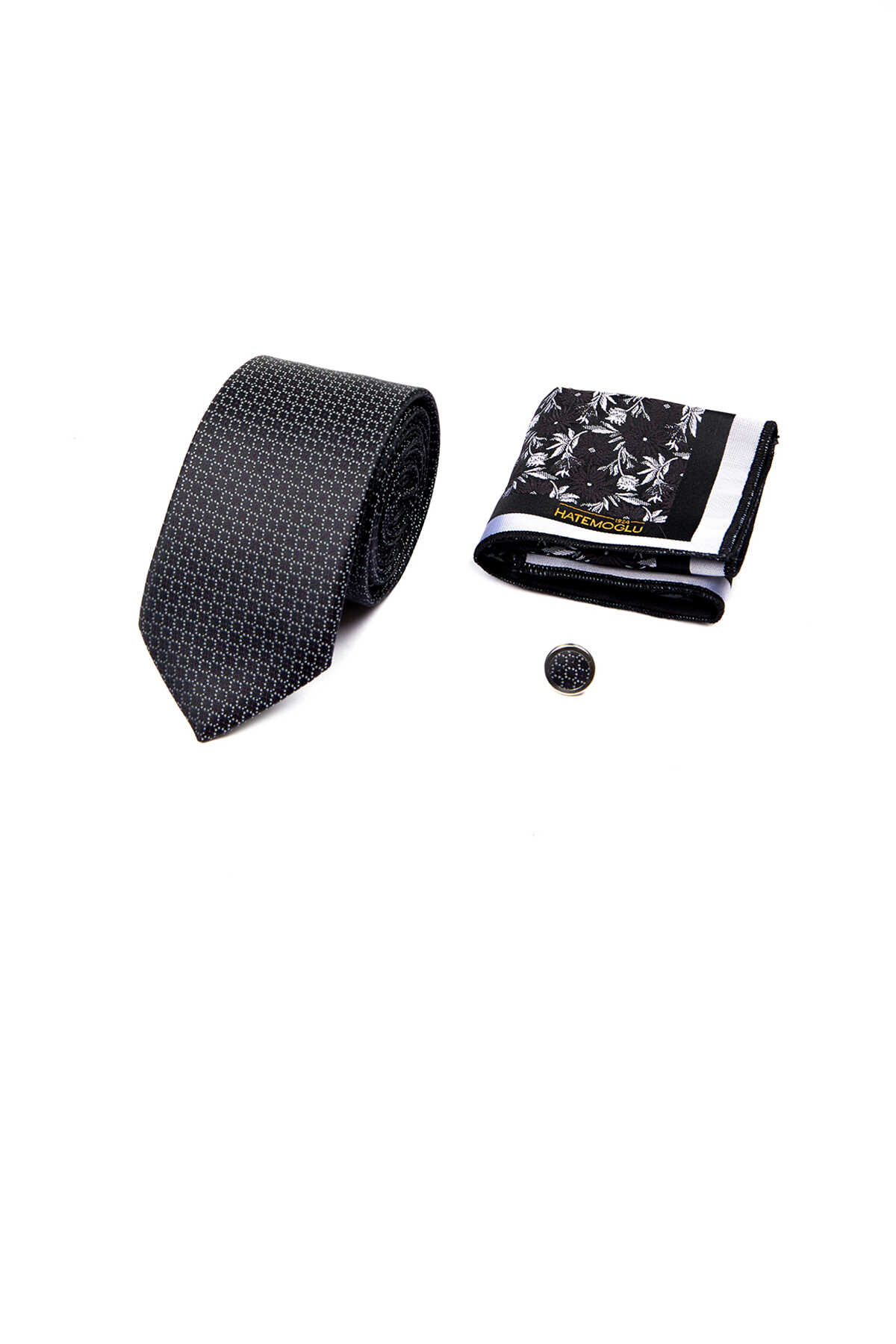 Siyah Üçlü Yaka Rozeti Kravat Mendil Set