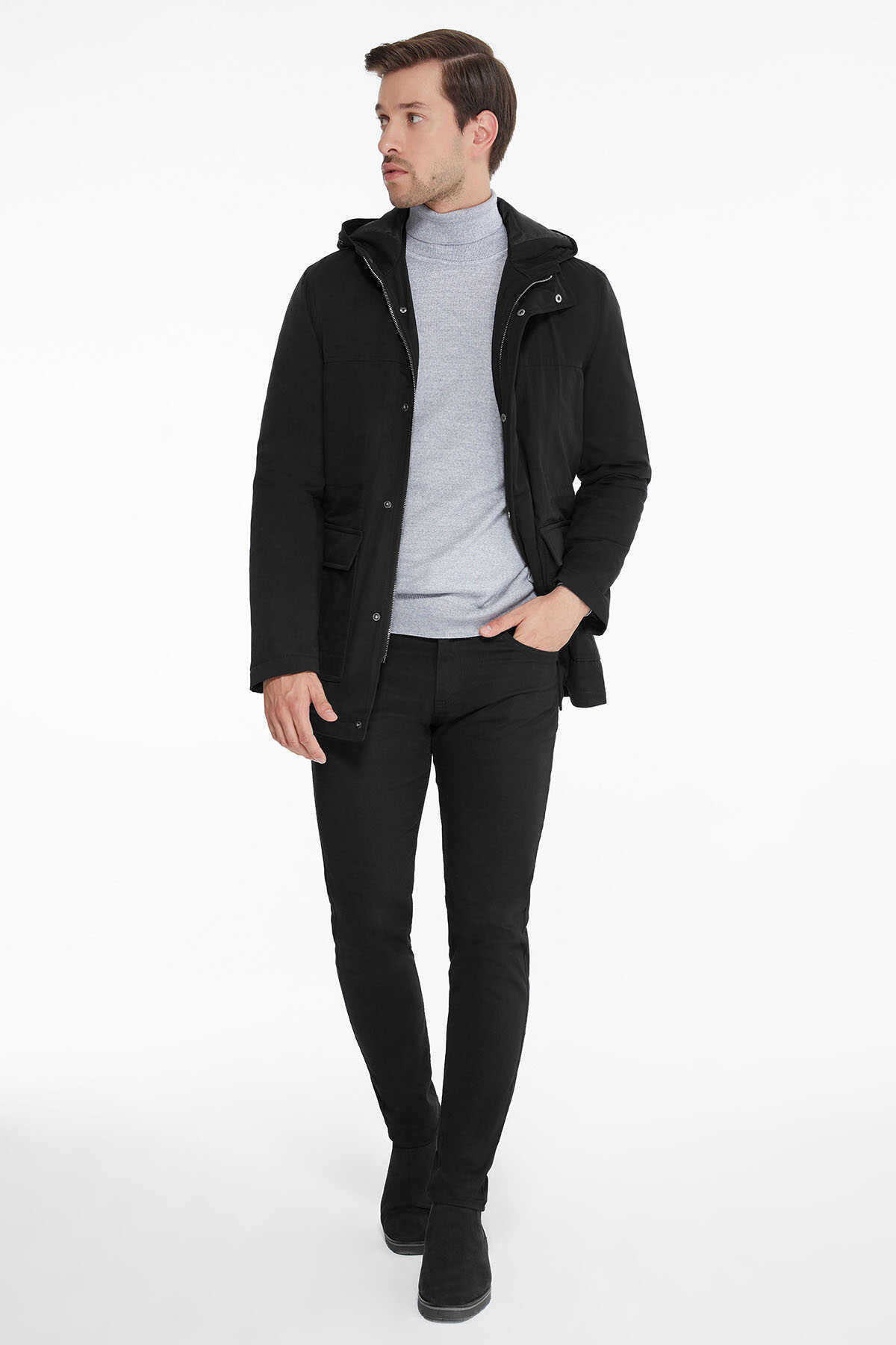 Siyah Boeno Kapüşonlu Hakim Yaka Kaban