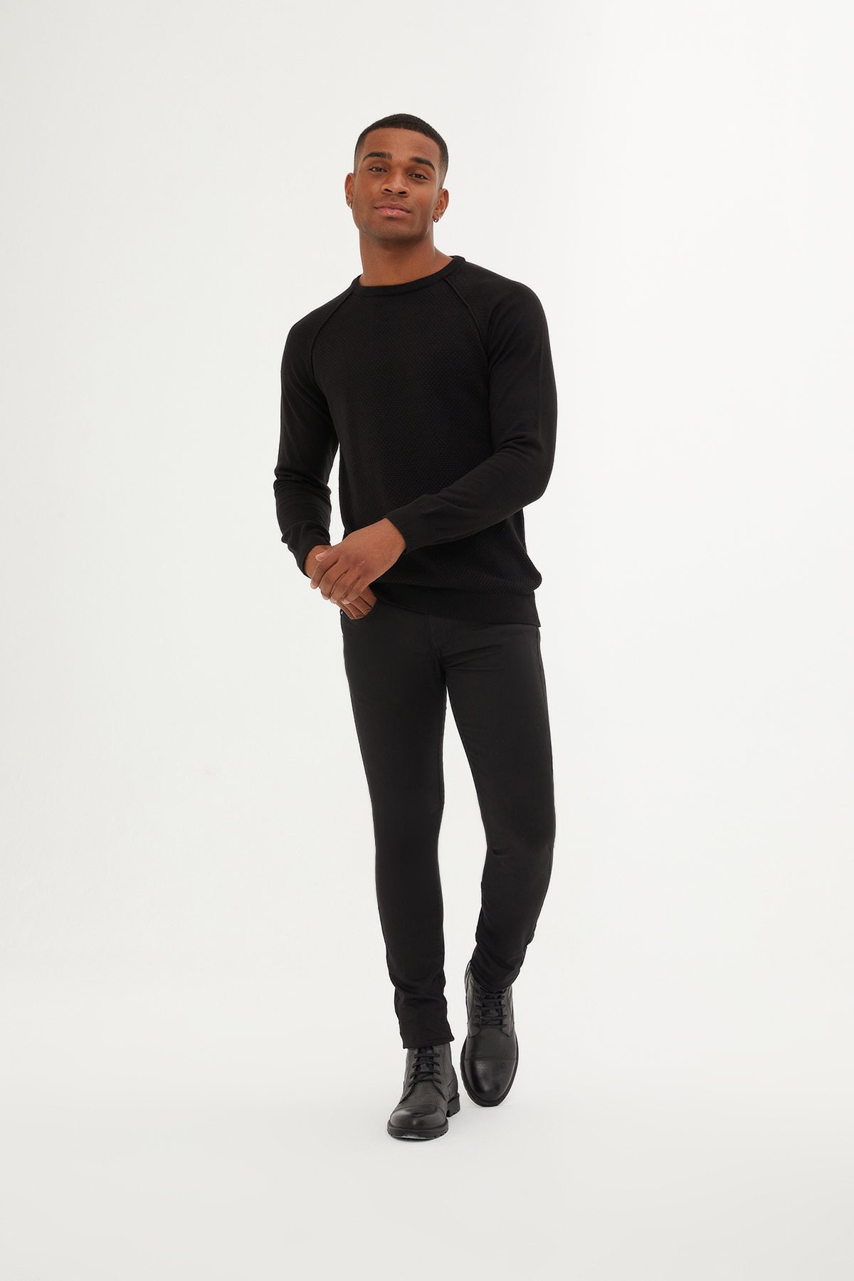 Siyah Slim Fit Desenli Pamuklu Bisiklet Yaka Triko Kazak