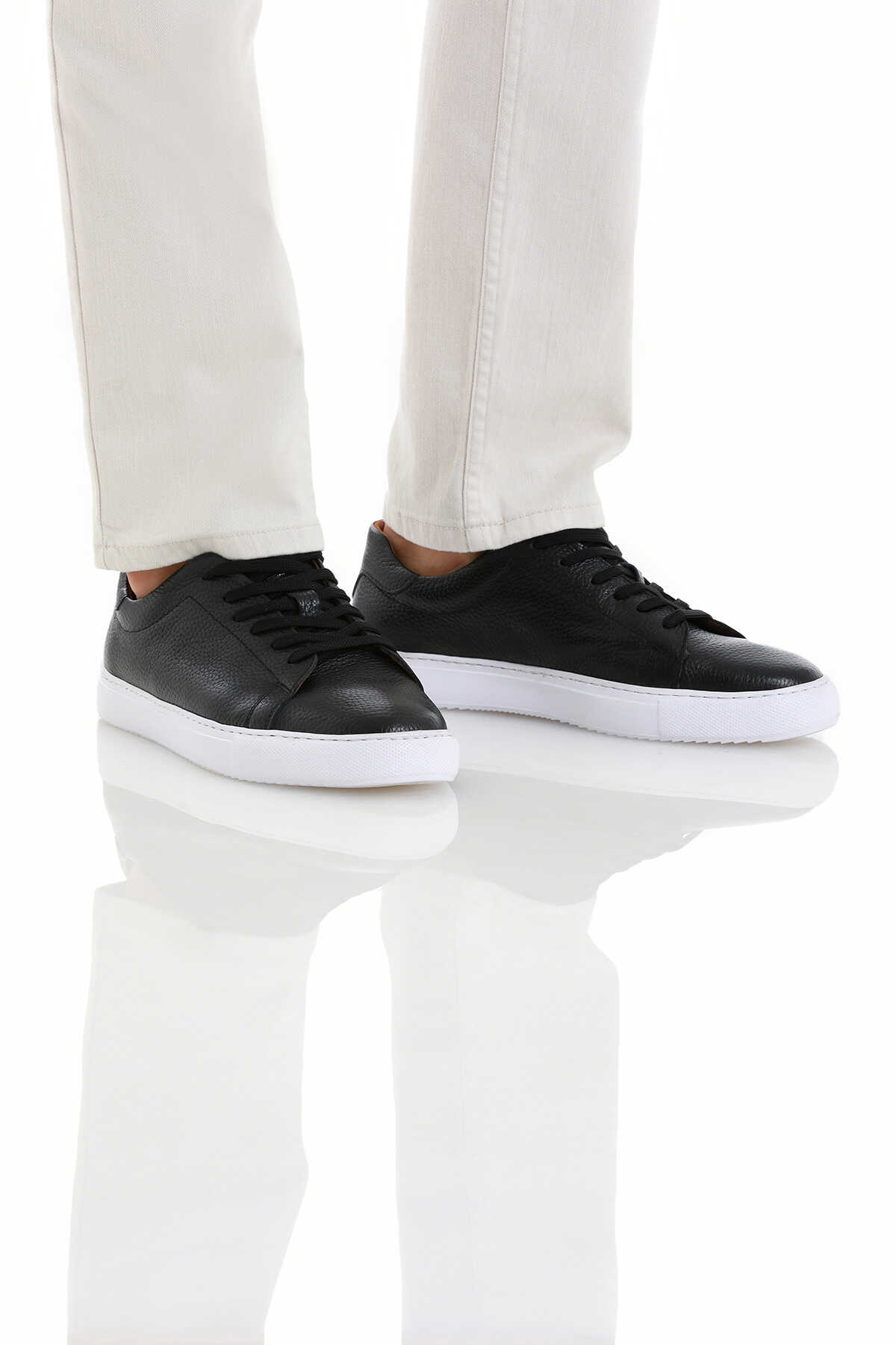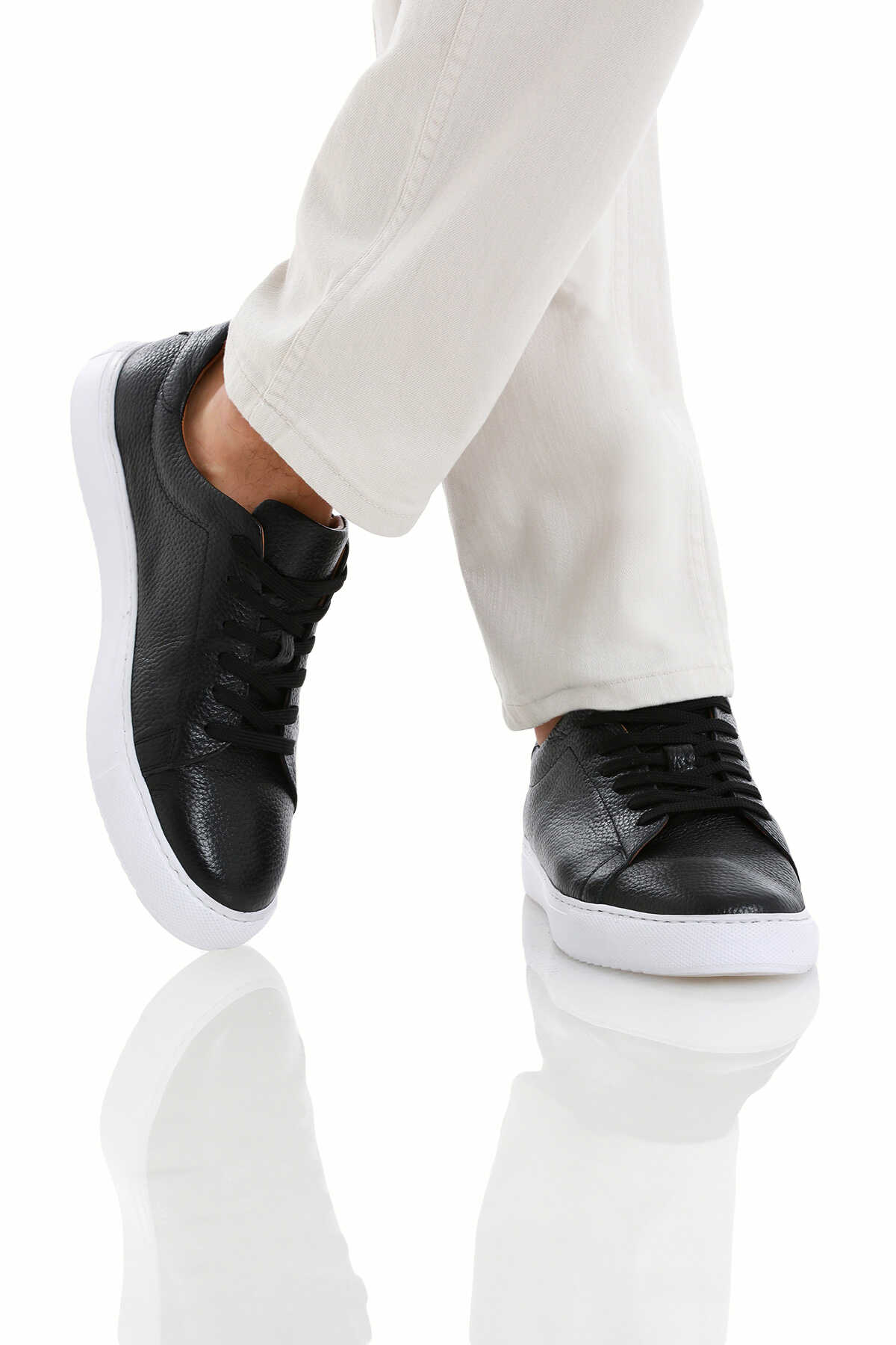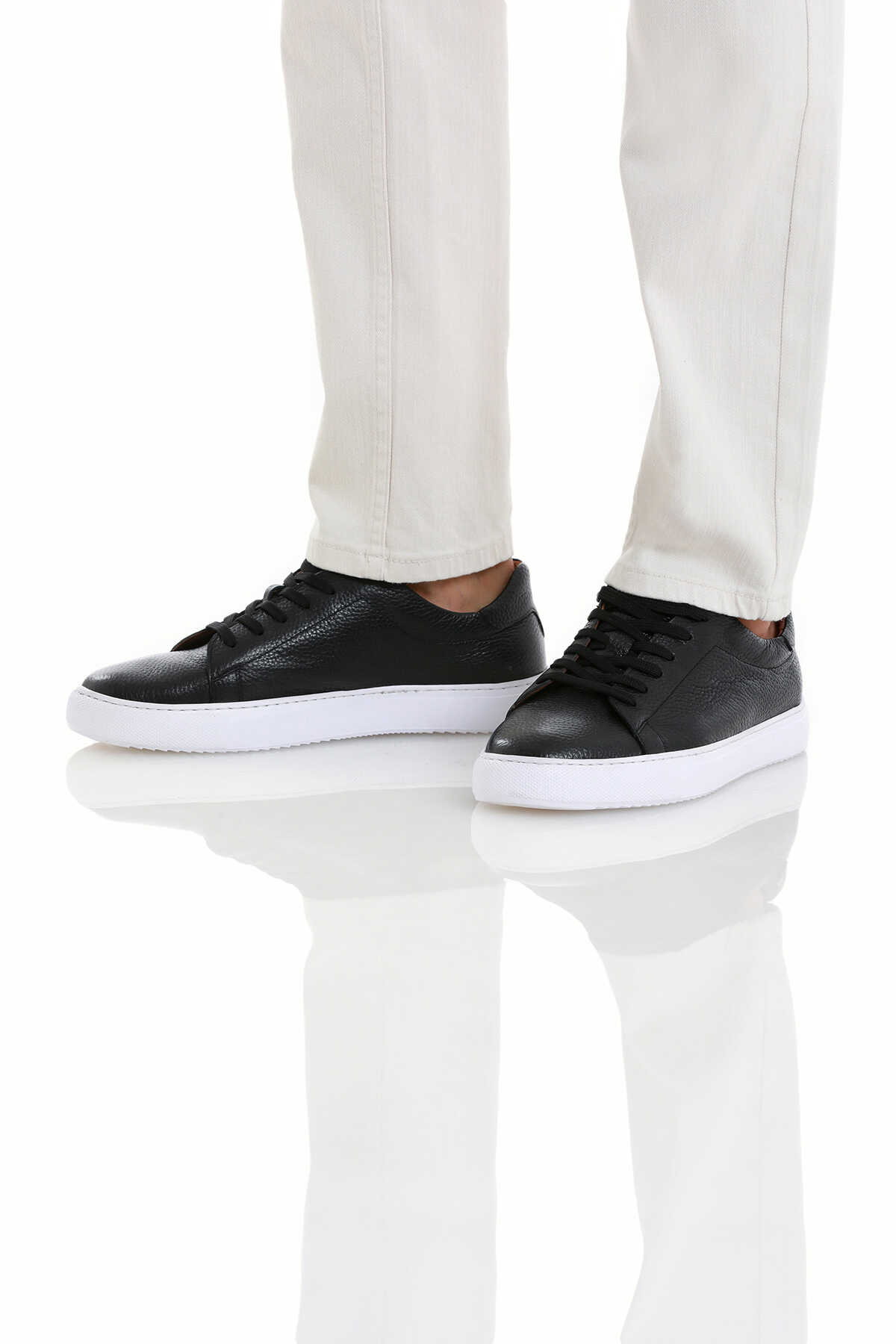 Siyah Casual Bağcıklı Deri Sneakers