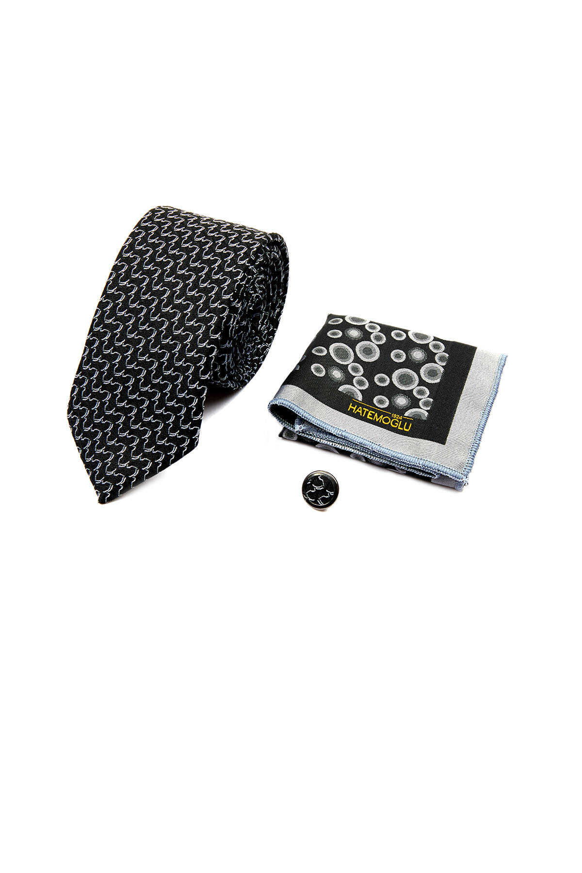 Siyah Üçlü Yaka Rozeti Kravat Mendil Set