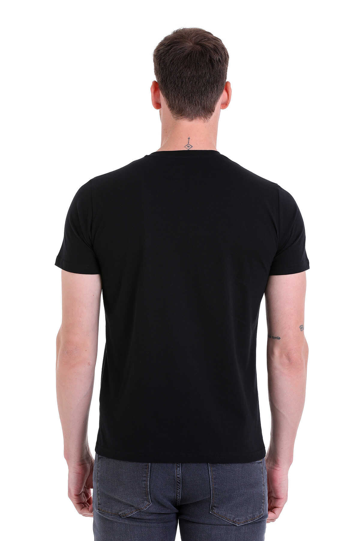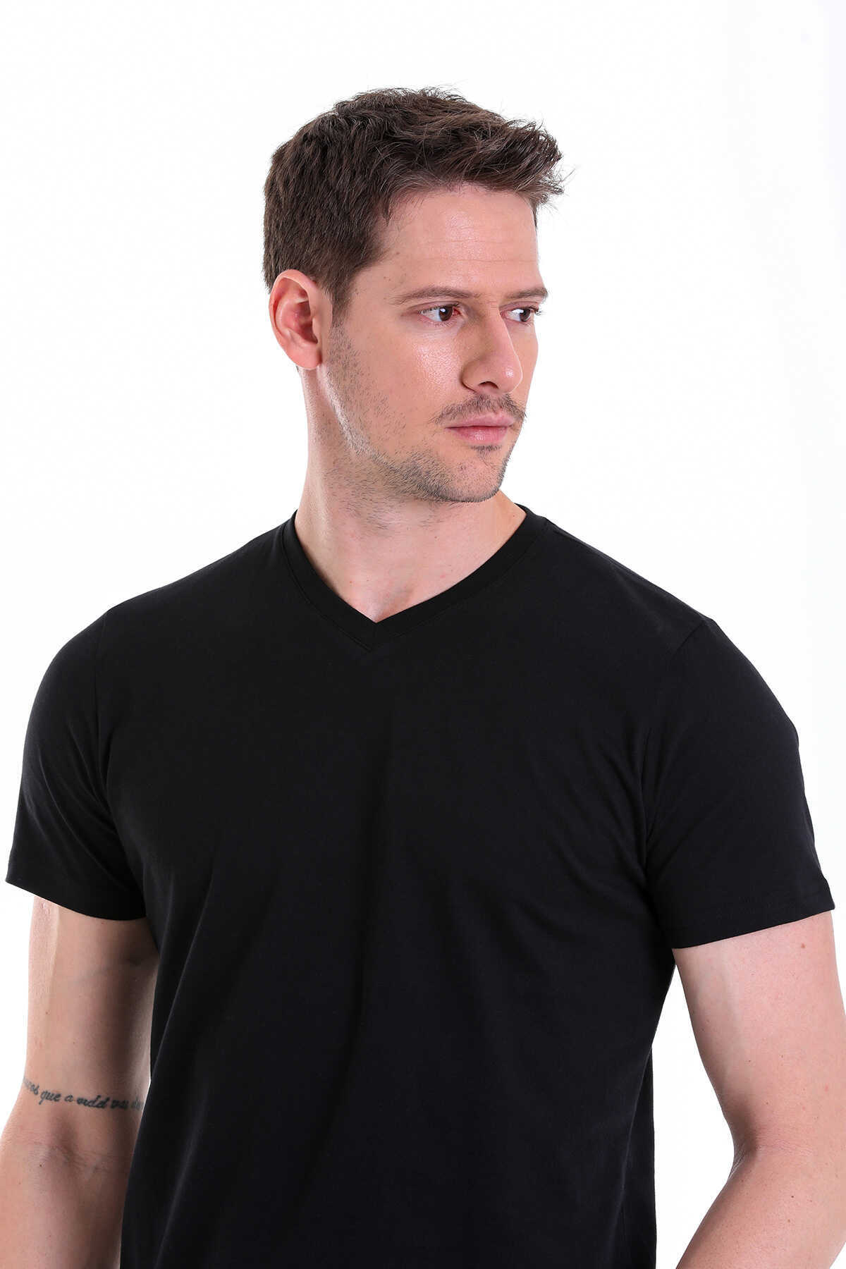 Siyah Regular Fit Düz 100% Pamuklu V Yaka Tişört - 6