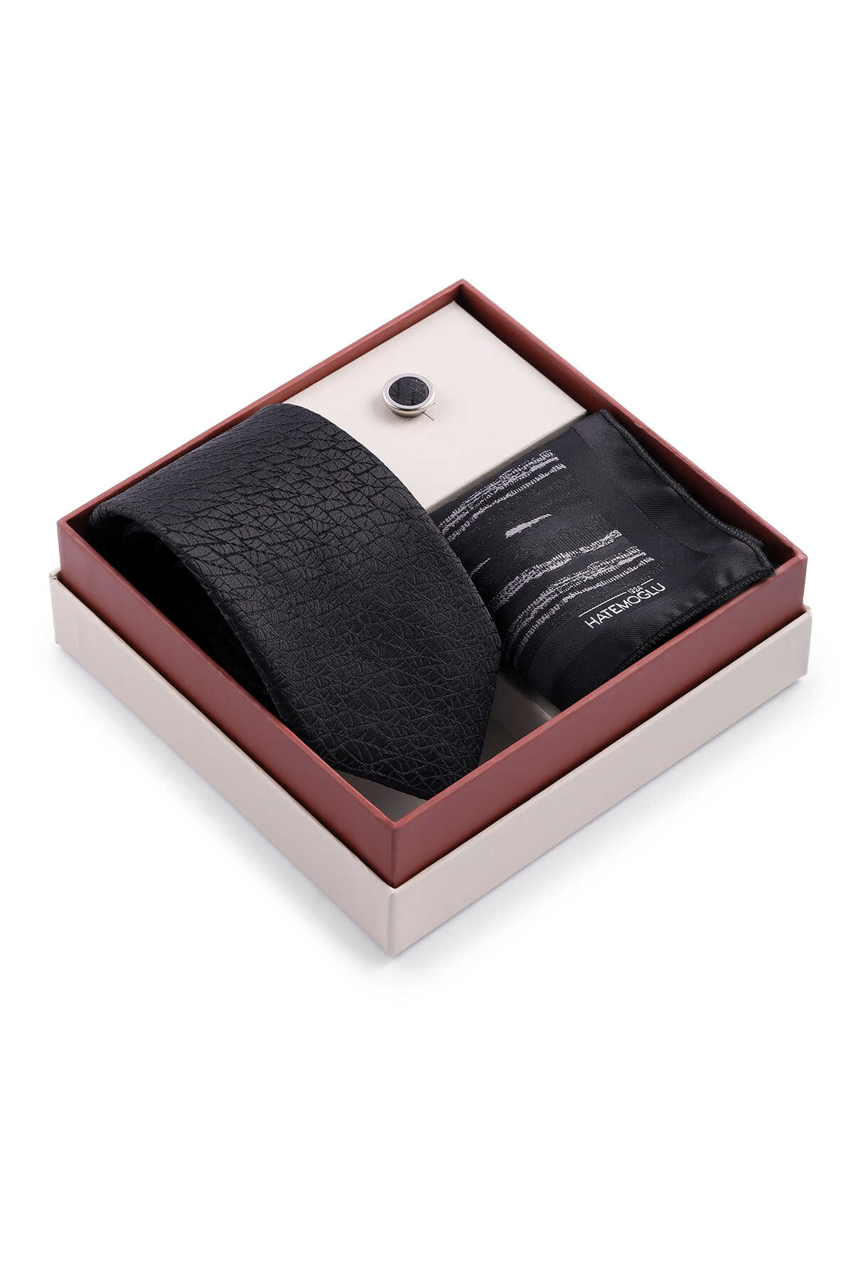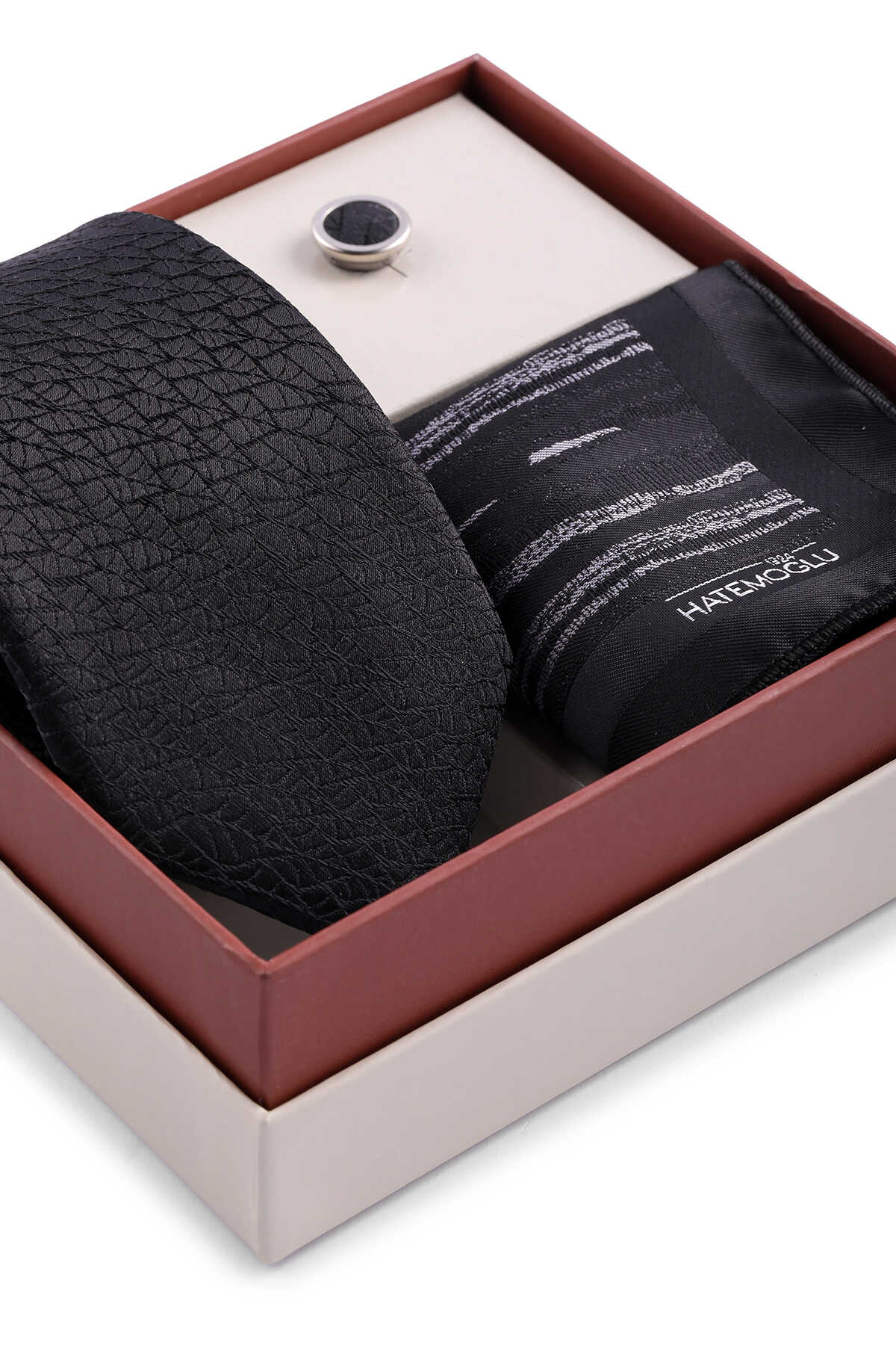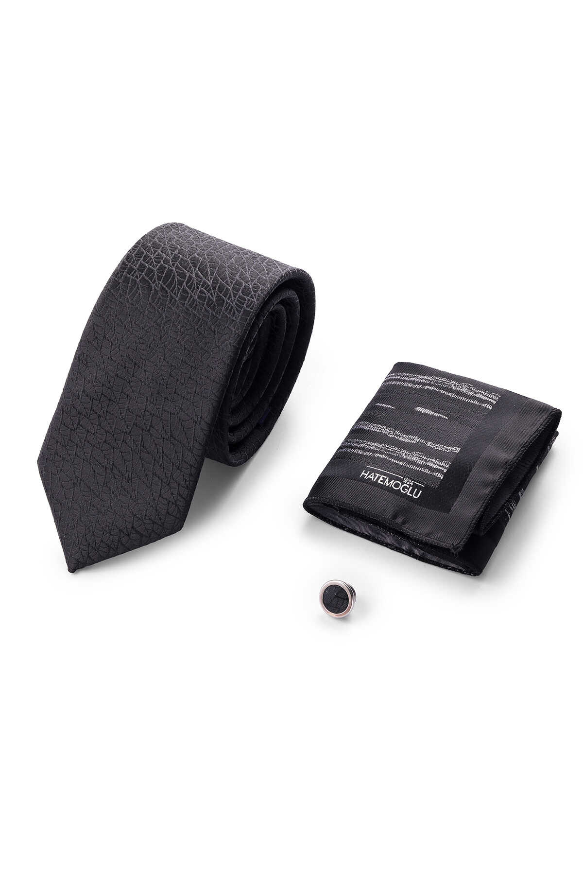 Siyah Üçlü Yaka Rozeti Kravat Mendil Set