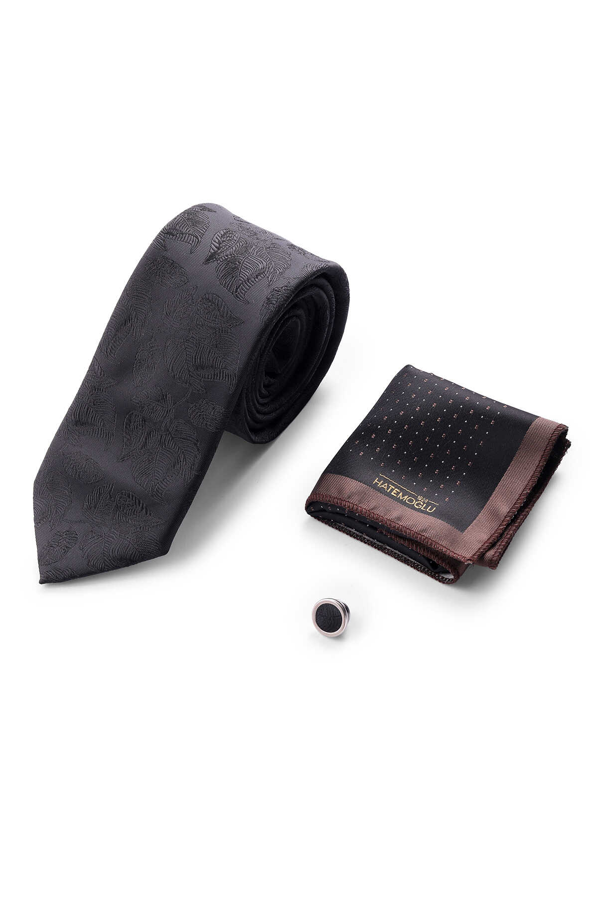 Siyah Üçlü Yaka Rozeti Kravat Mendil Set