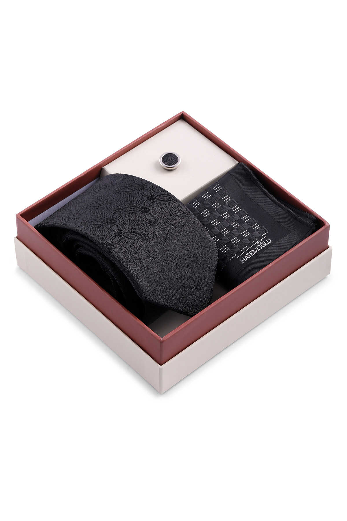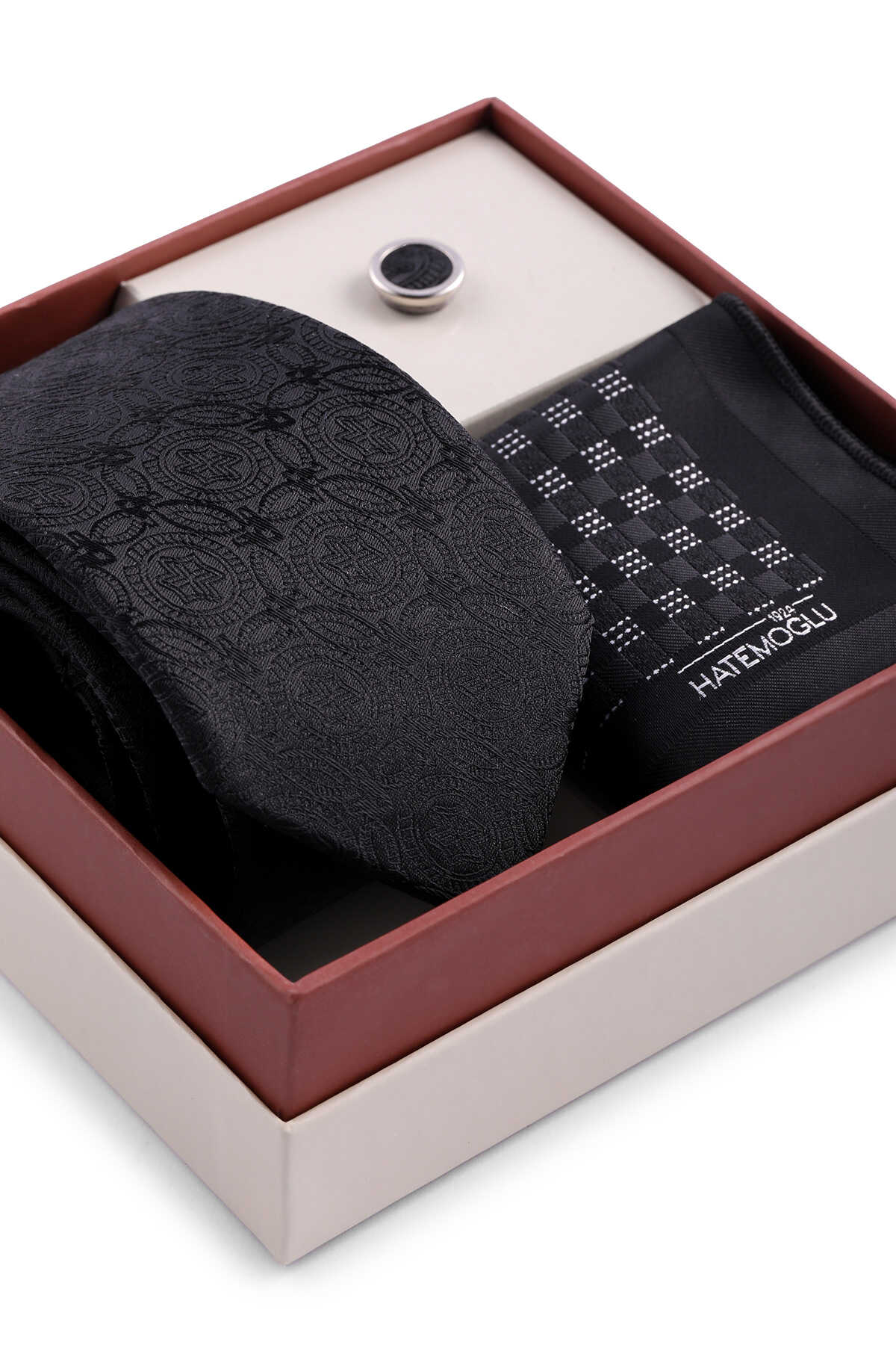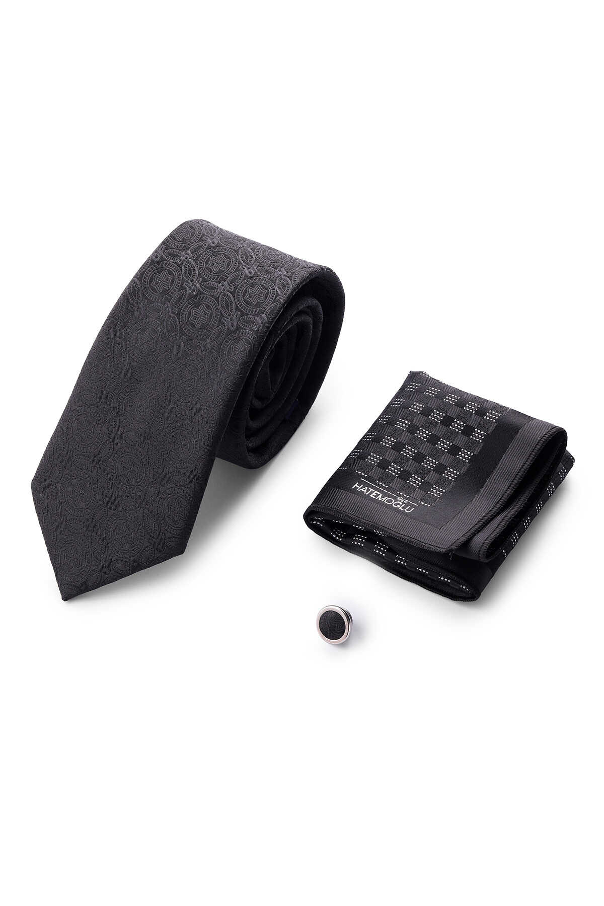 Siyah Üçlü Yaka Rozeti Kravat Mendil Set