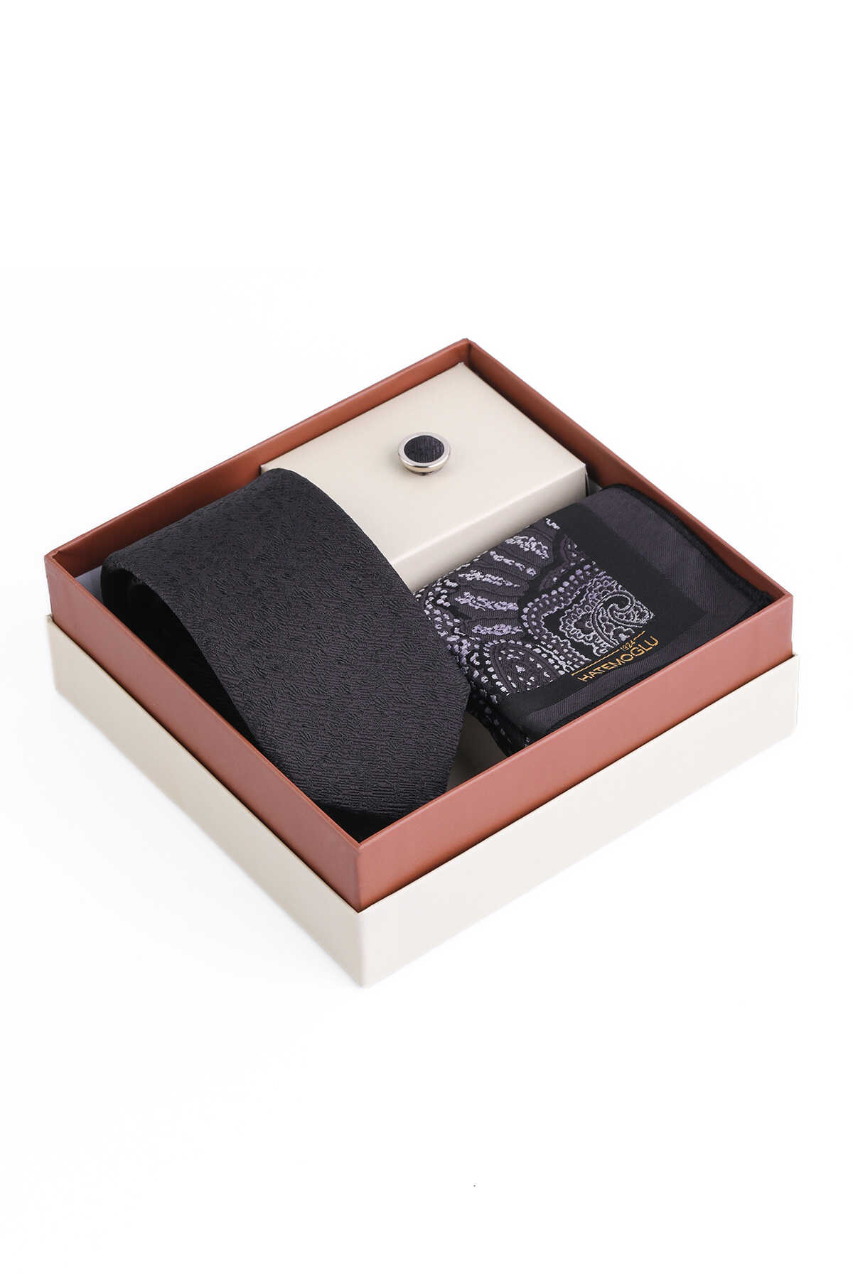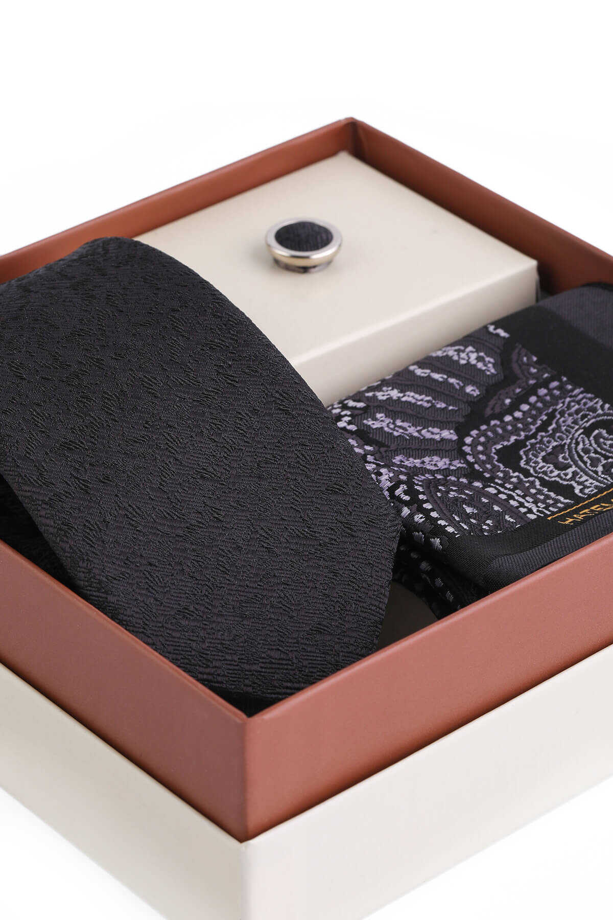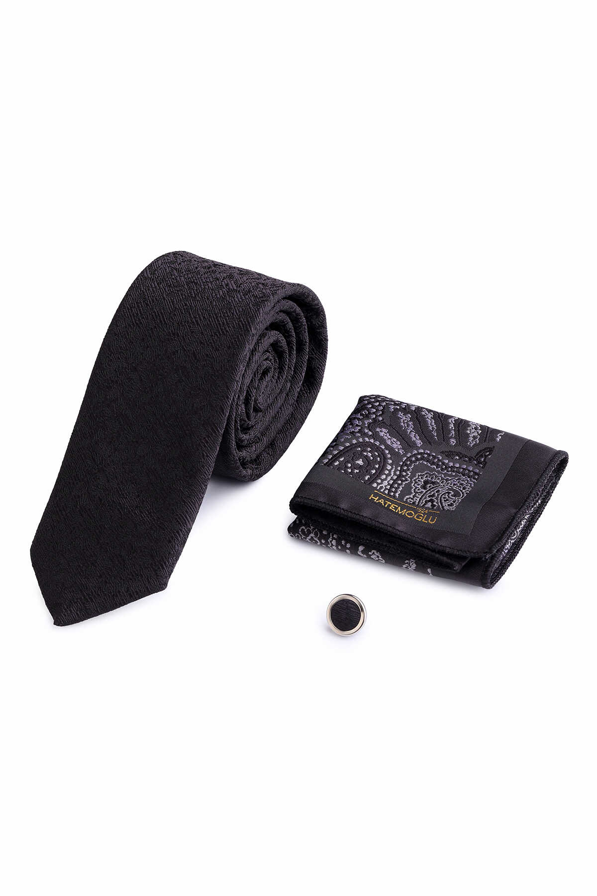 Siyah Üçlü Yaka Rozeti Kravat Mendil Set