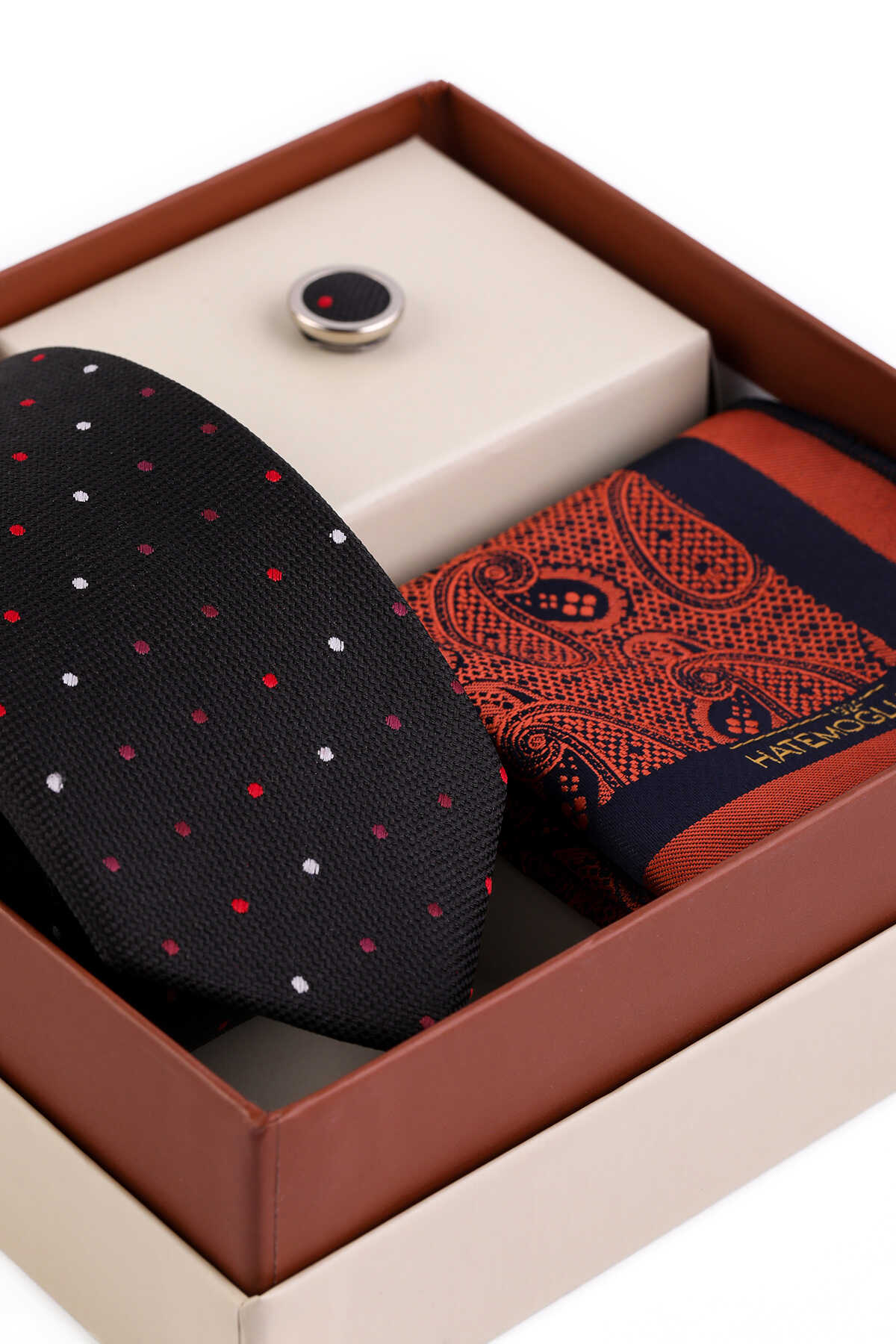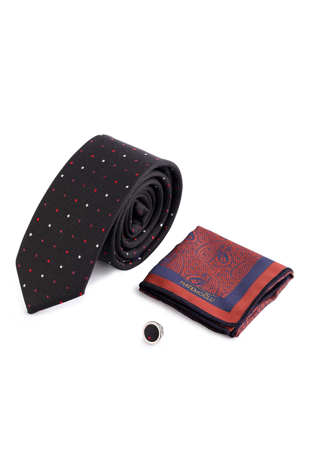 Siyah Üçlü Yaka Rozeti Kravat Mendil Set