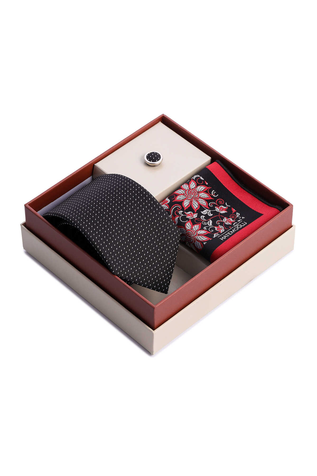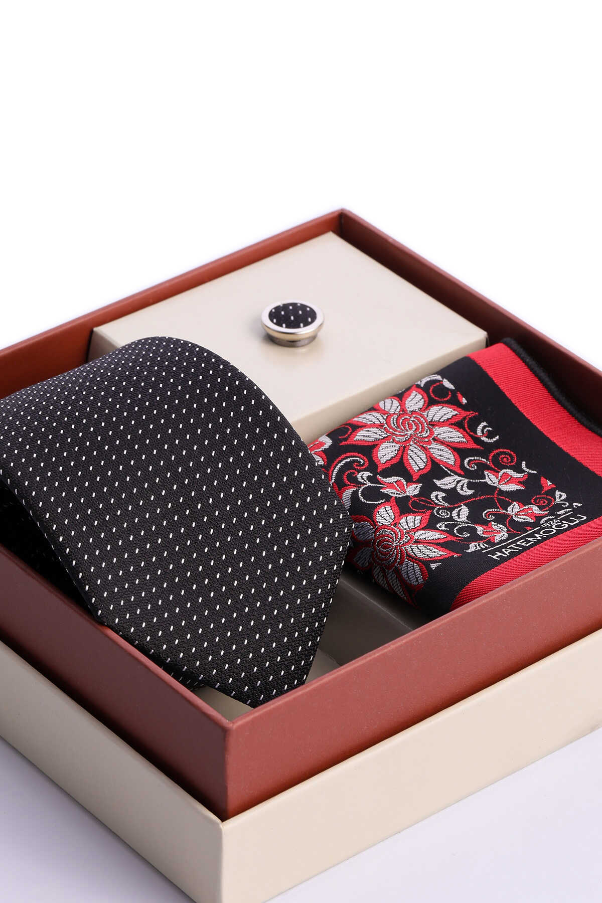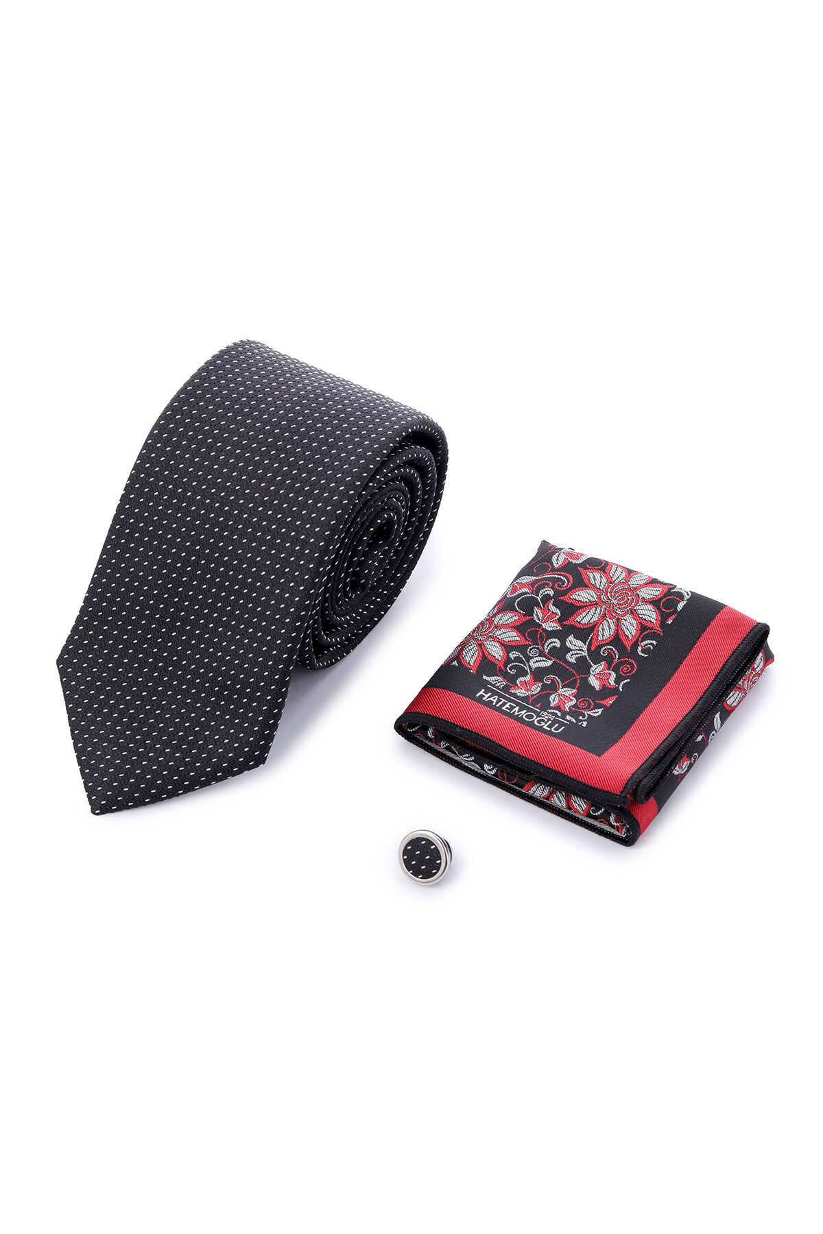 Siyah Üçlü Yaka Rozeti Kravat Mendil Set
