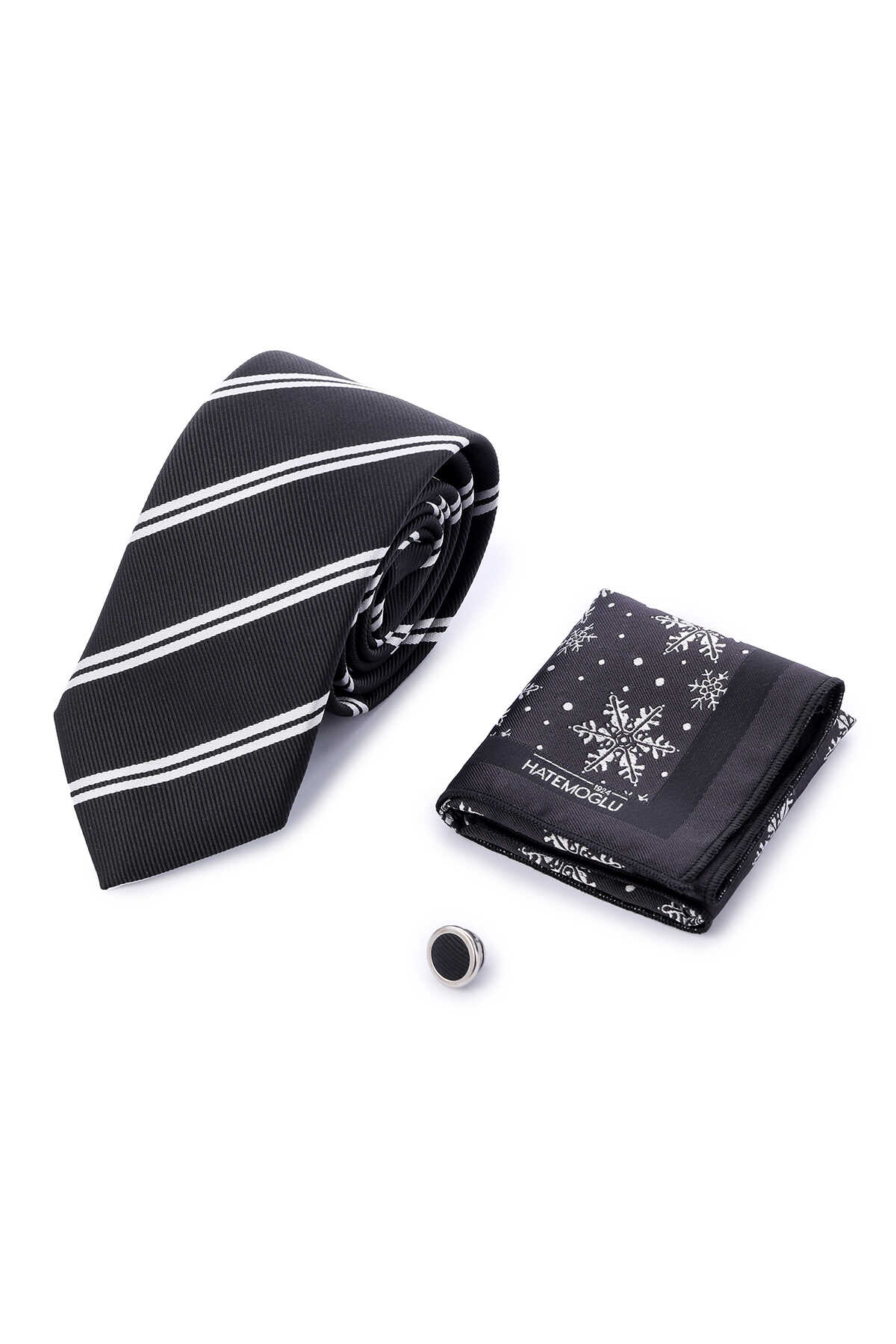 Siyah Üçlü Yaka Rozeti Kravat Mendil Set
