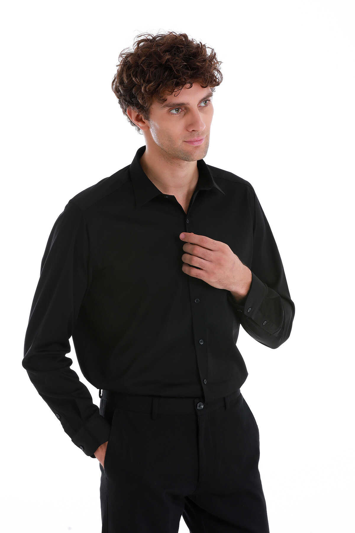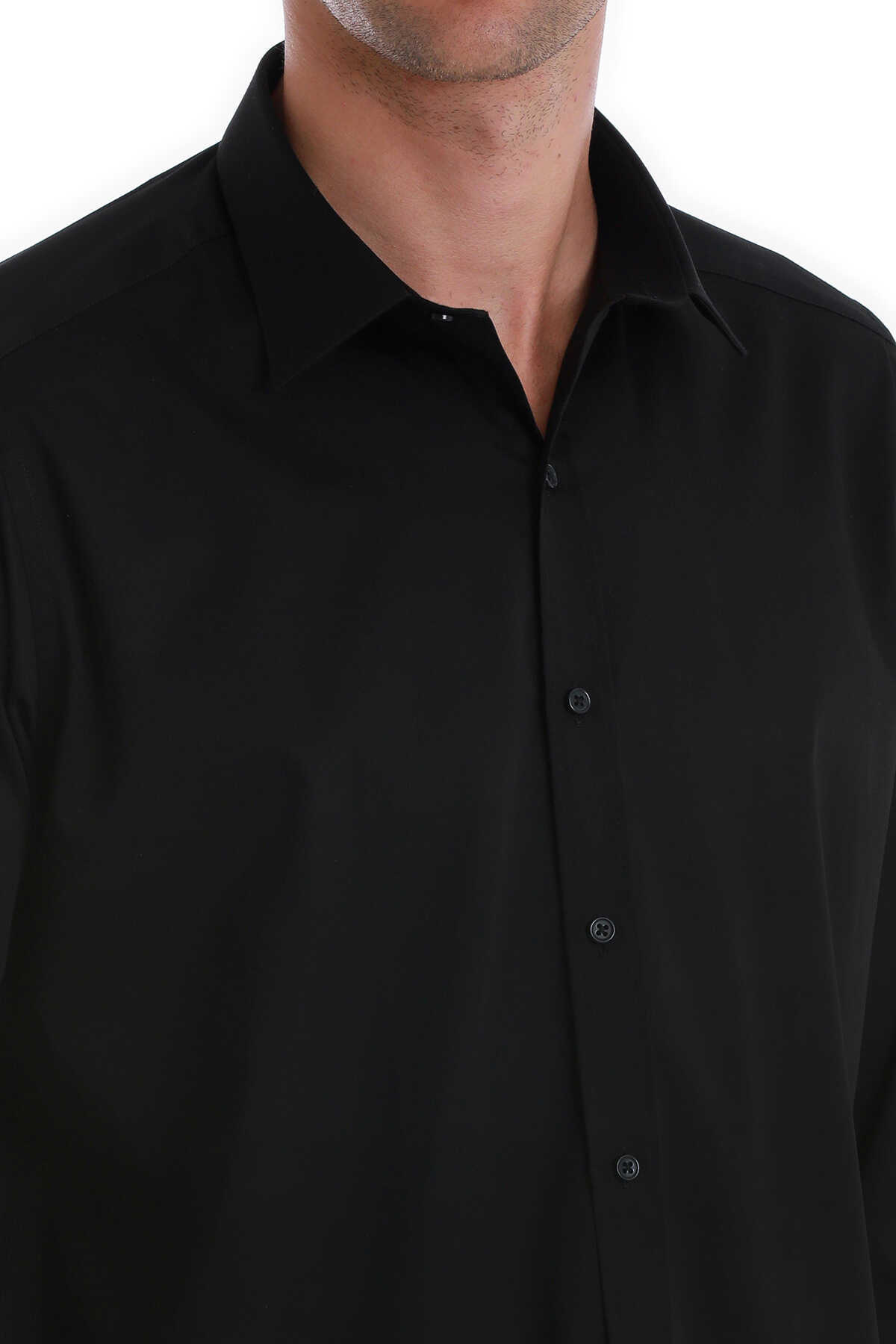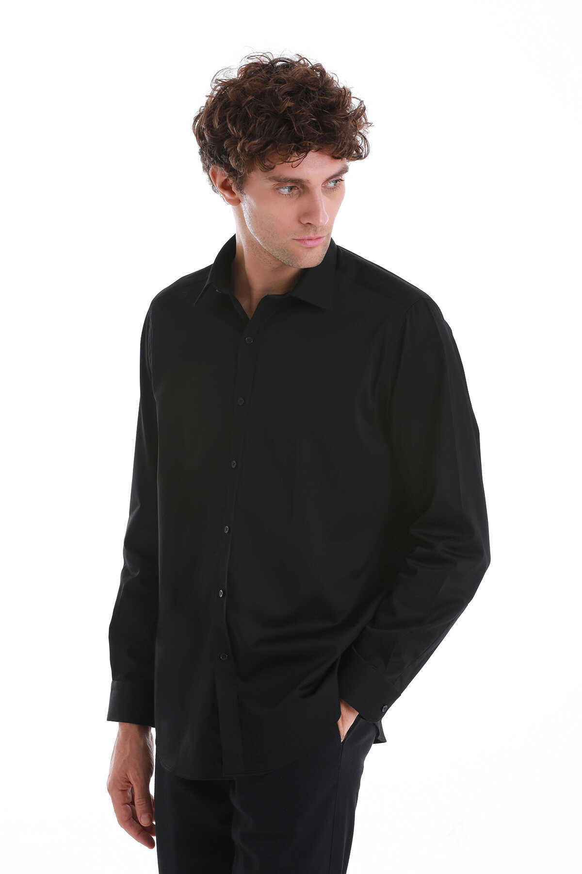 Siyah Klasik Fit 100% Pamuk Slim Yaka Uzun Kollu Saten Gömlek