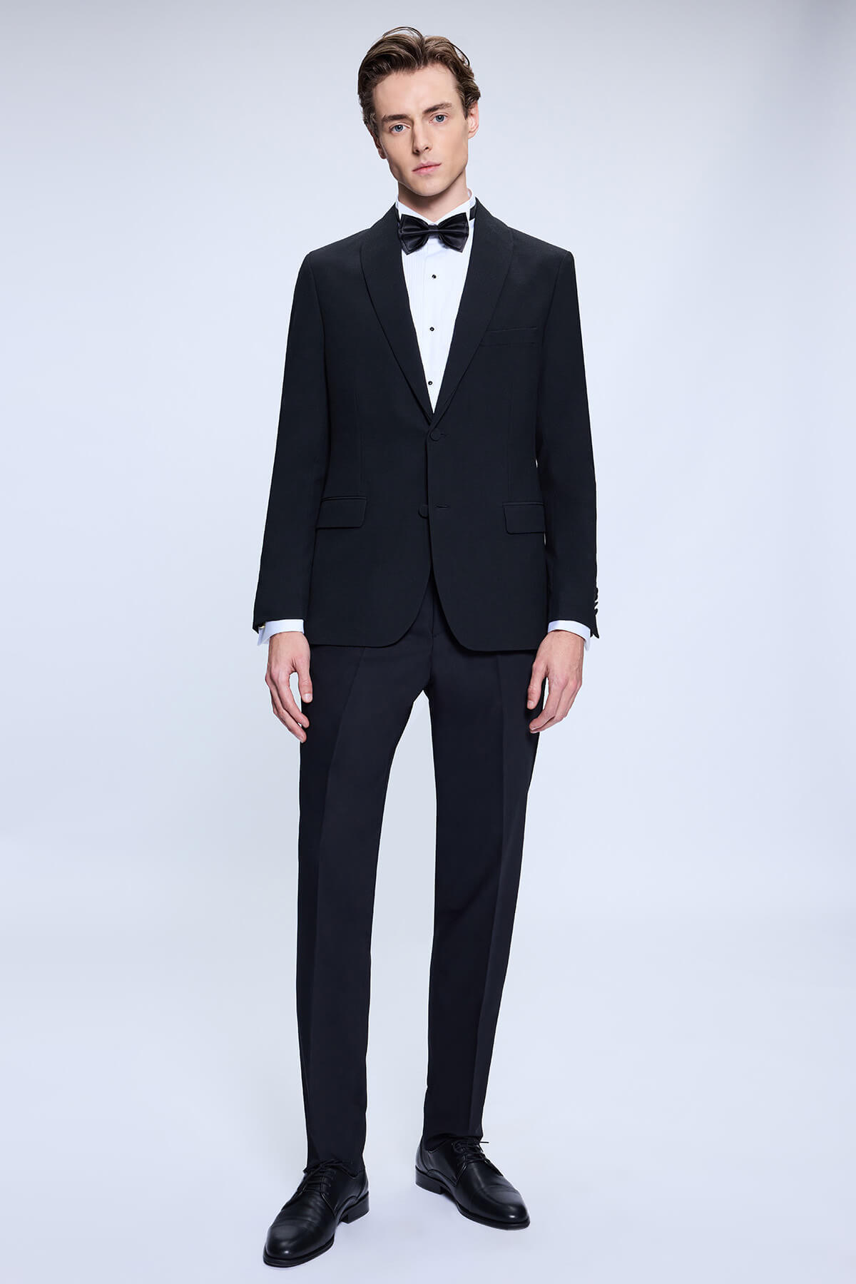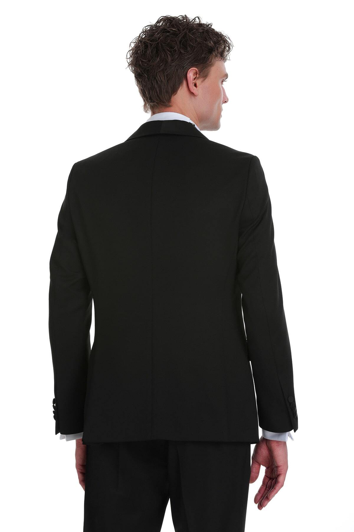 Siyah Slim Fit Çıkma Şal Yaka Klasik Damatlık, en özel günleriniz için tasarlanmış, klasik duruşu modern ve vücuda oturan Slim Fit kalıbıyla birleştiren bir smokin takımıdır. Ceketin saten görünümlü Çıkma Şal Yaka detayı, damatlığa sofistike ve çarpıcı bir görünüm katarken, takımın genel siyah asaleti resmiyetinizi pekiştirir.