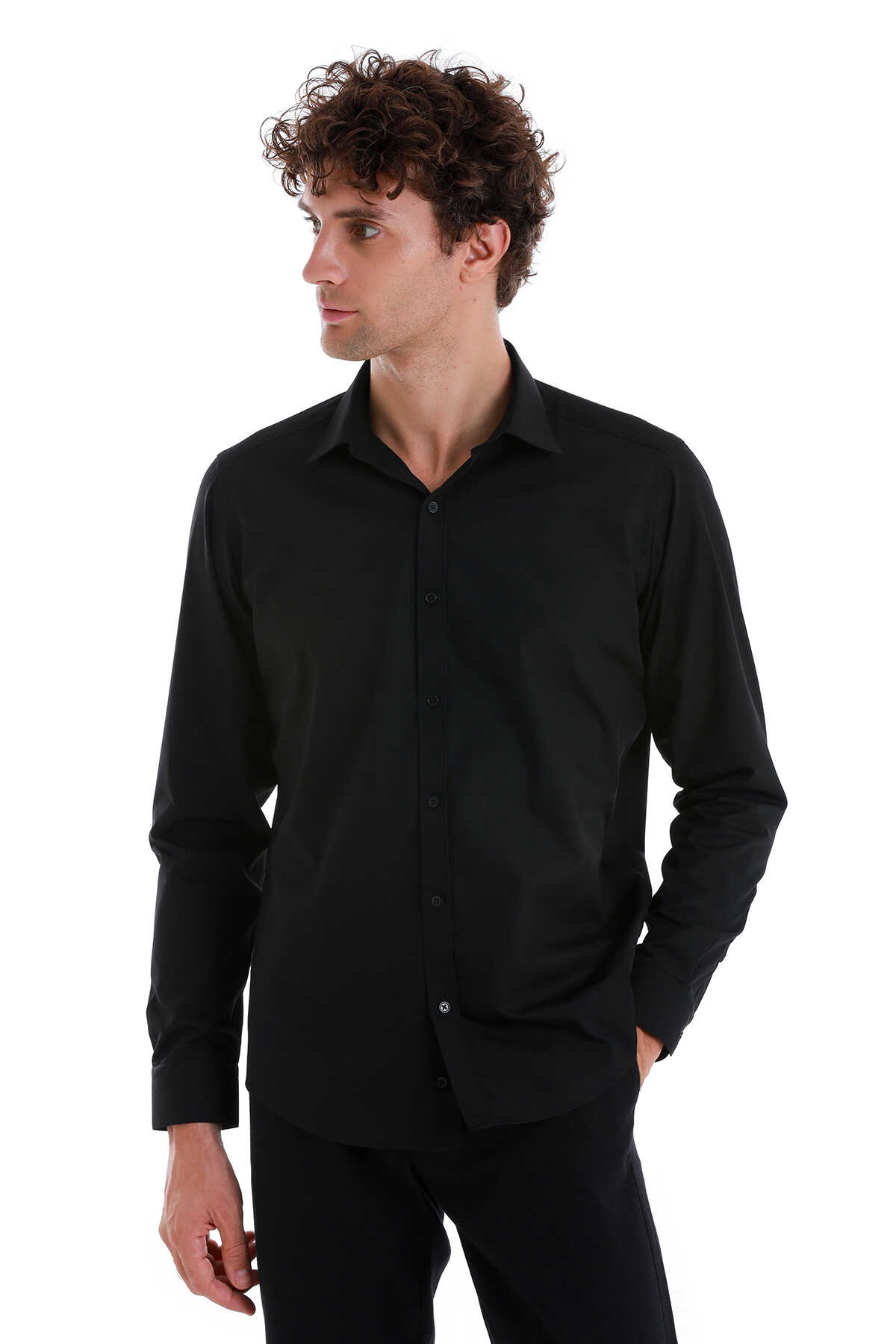 Siyah Slim Fit Slim Yaka Pamuklu Uzun Kollu Spor Gömlek