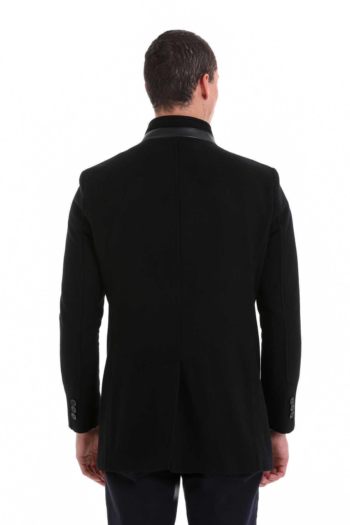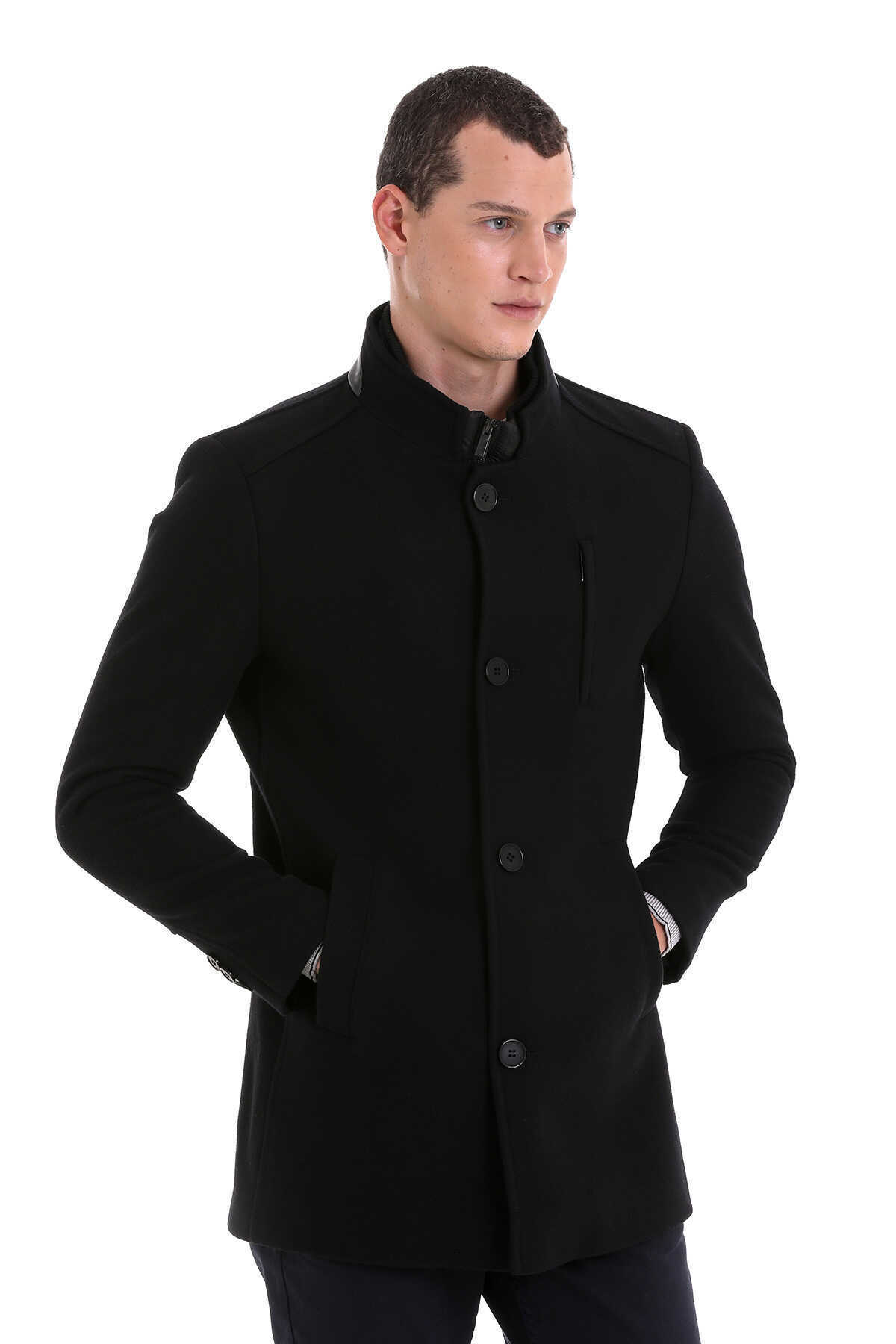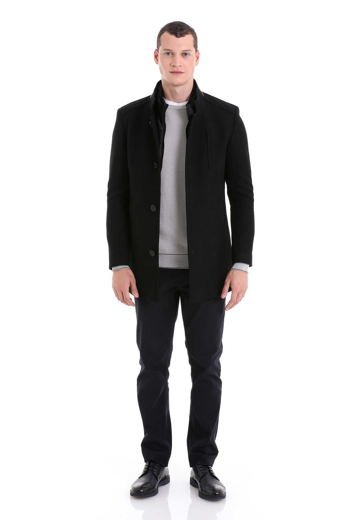 Siyah Slim Fit Hakim Yaka İçlikli Yünlü Basic Palto