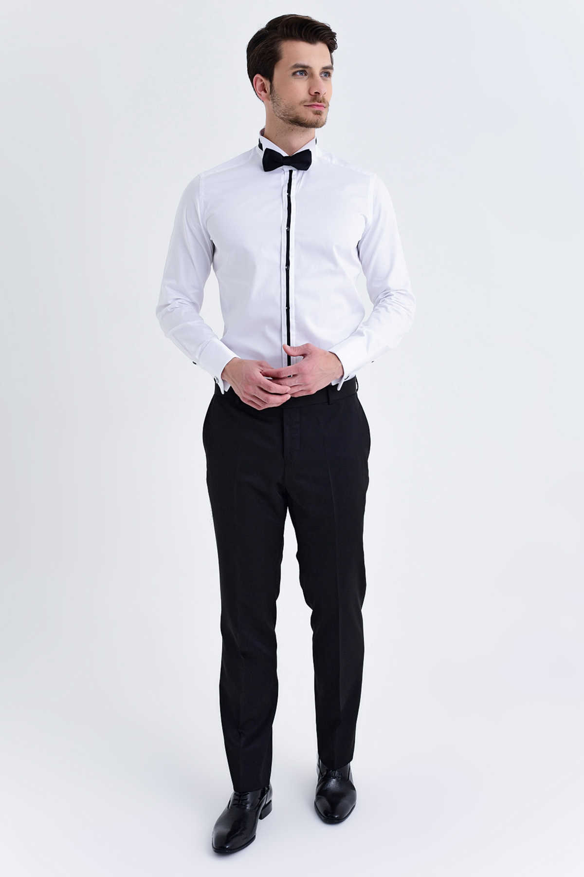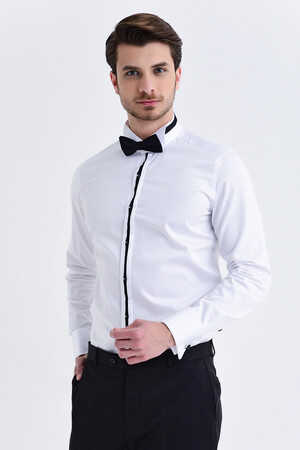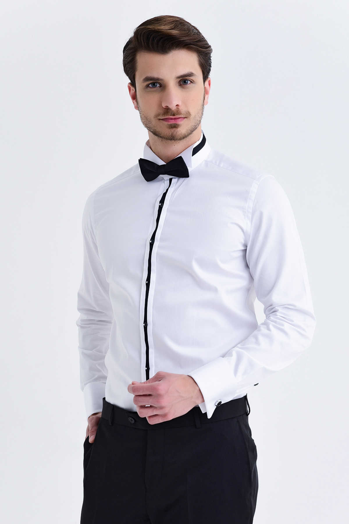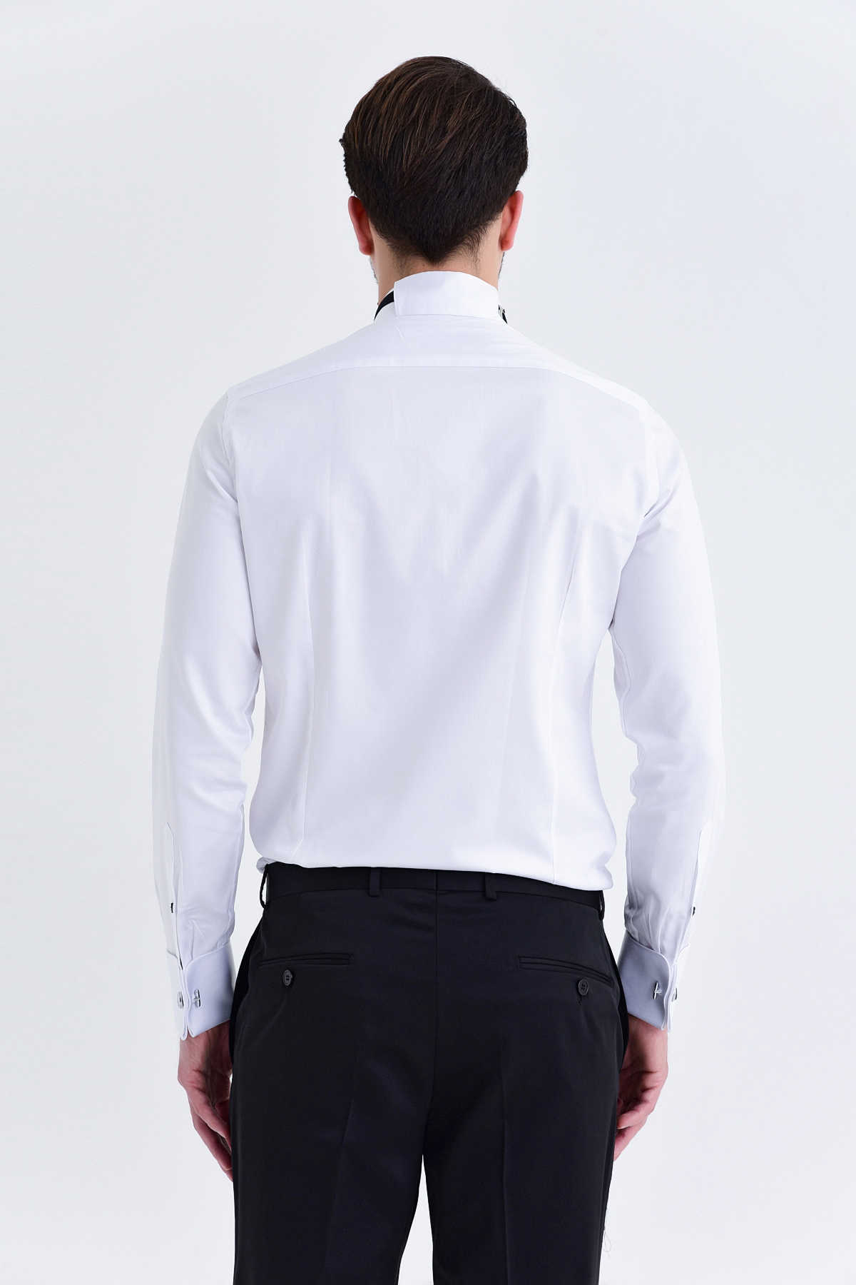 Beyaz Slim Fit Ata Yaka Şeritli %100 Pamuk Uzun Kollu Damatlık Gömlek