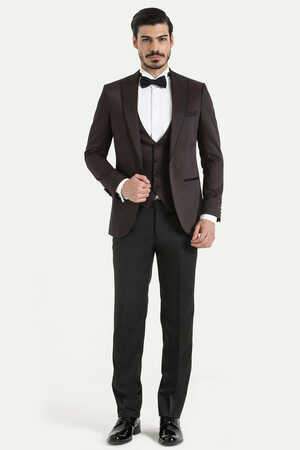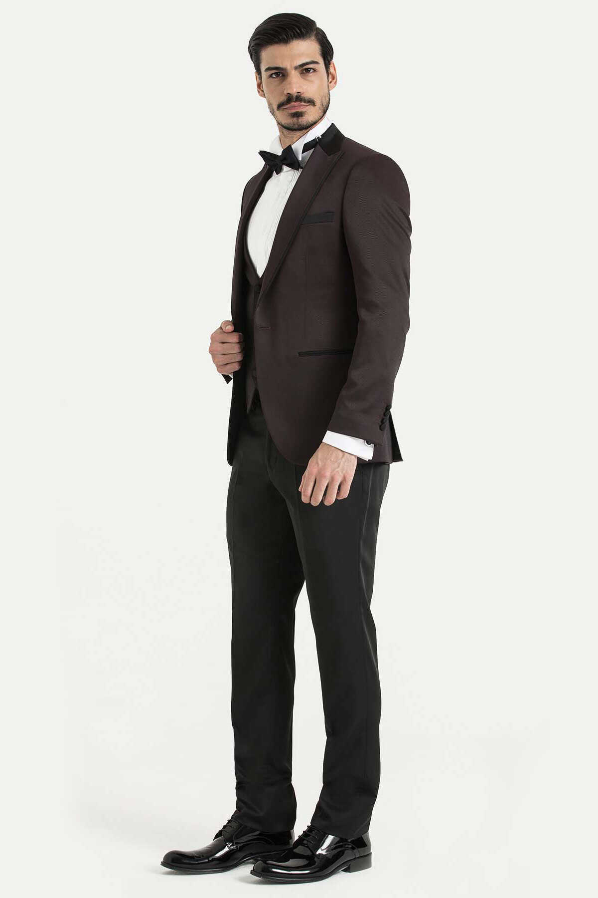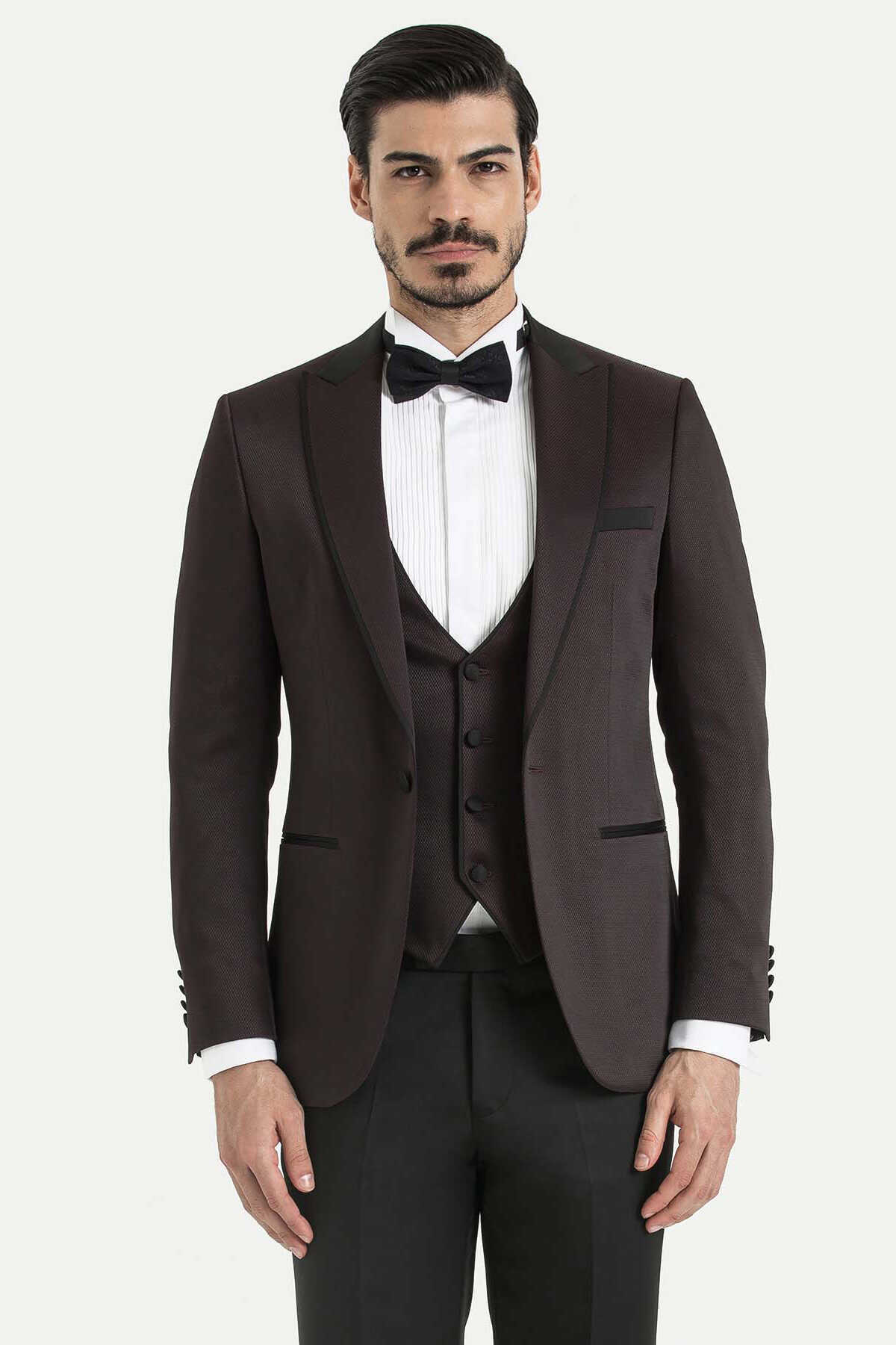 Bordo Slim Fit Sivri Yaka Yelekli Damatlık