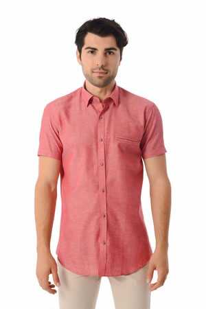 Kırmızı Slim Fit Kısa Kol Keten Gömlek