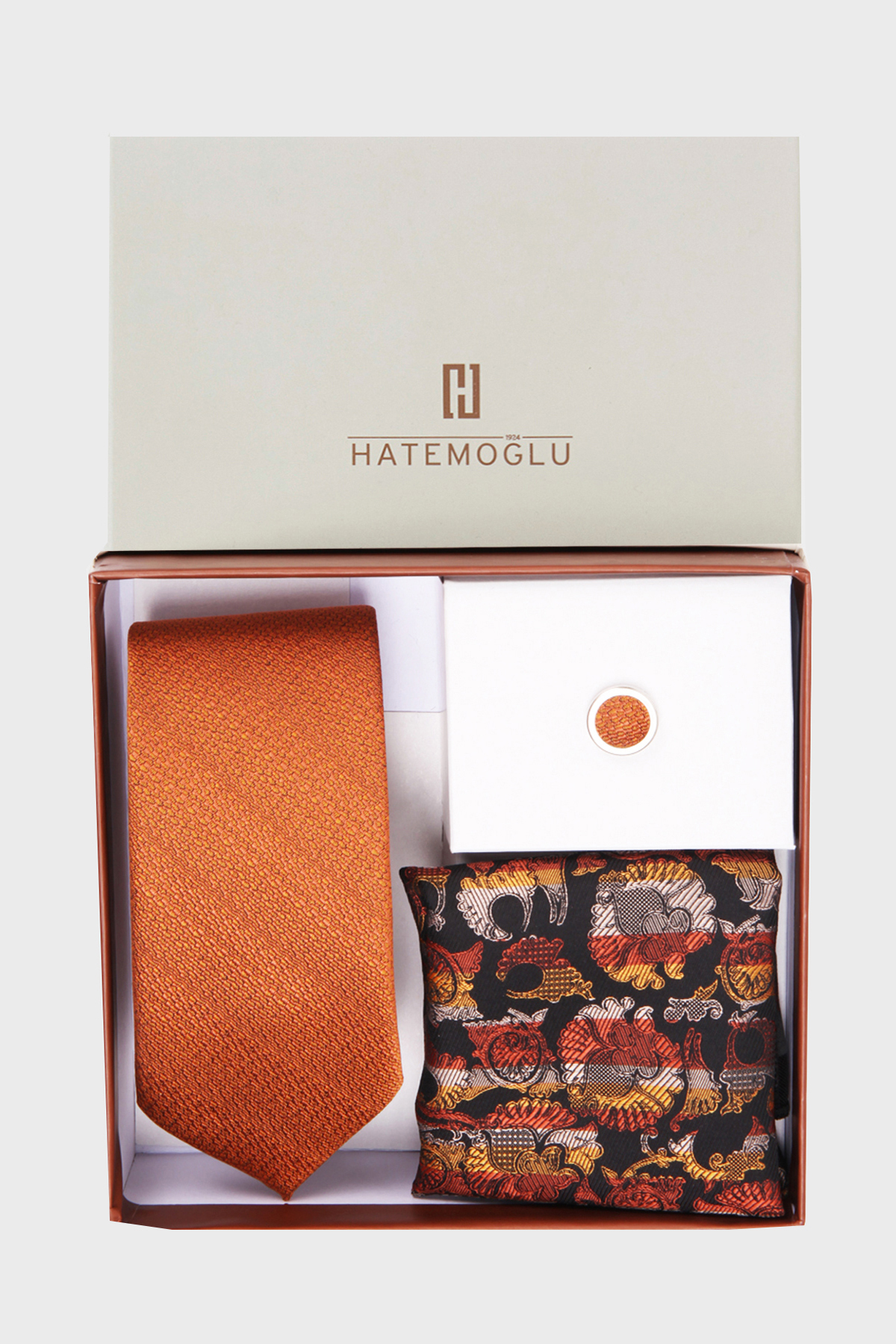 Turuncu Üçlü Kravat Mendil Yaka Rozeti Set