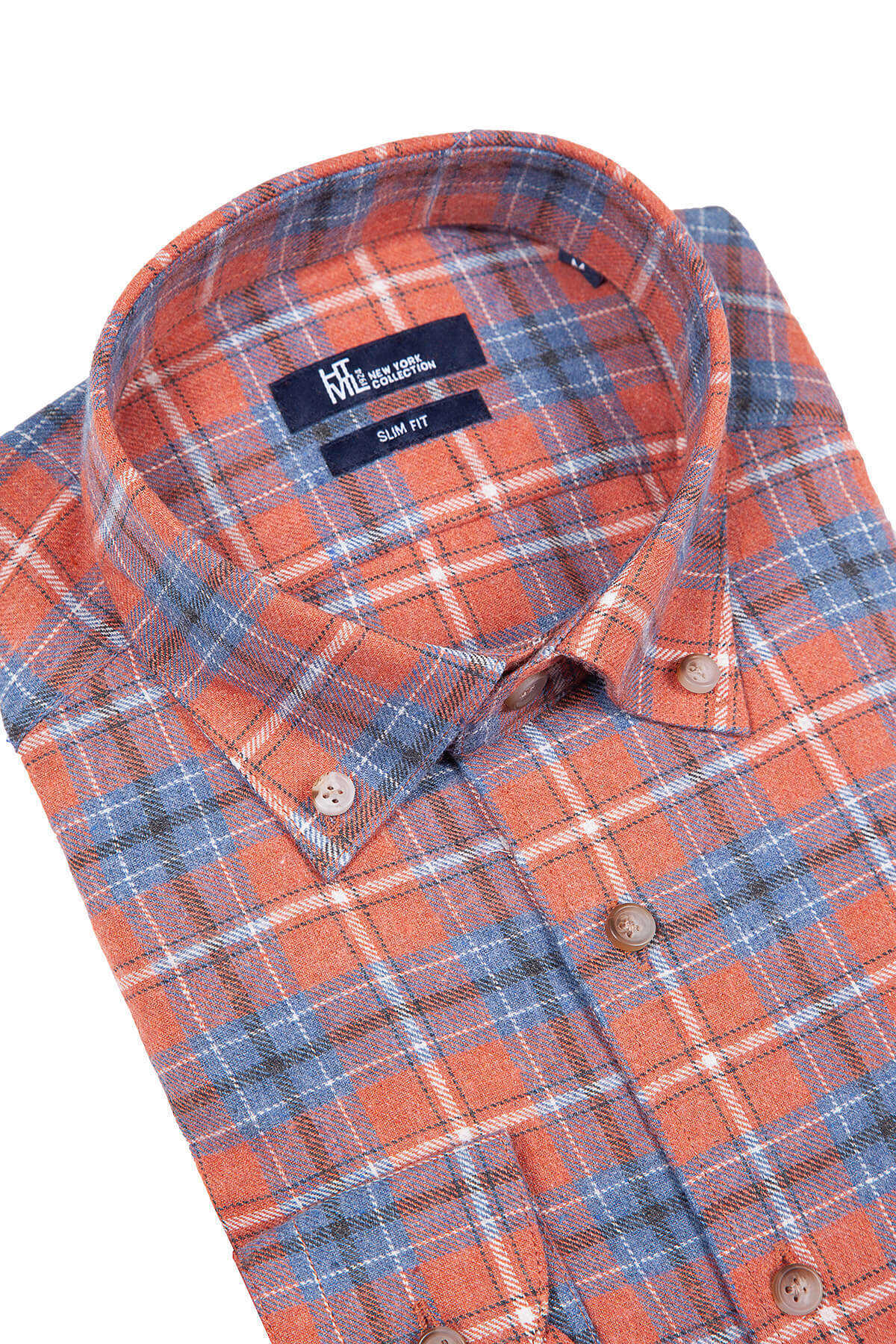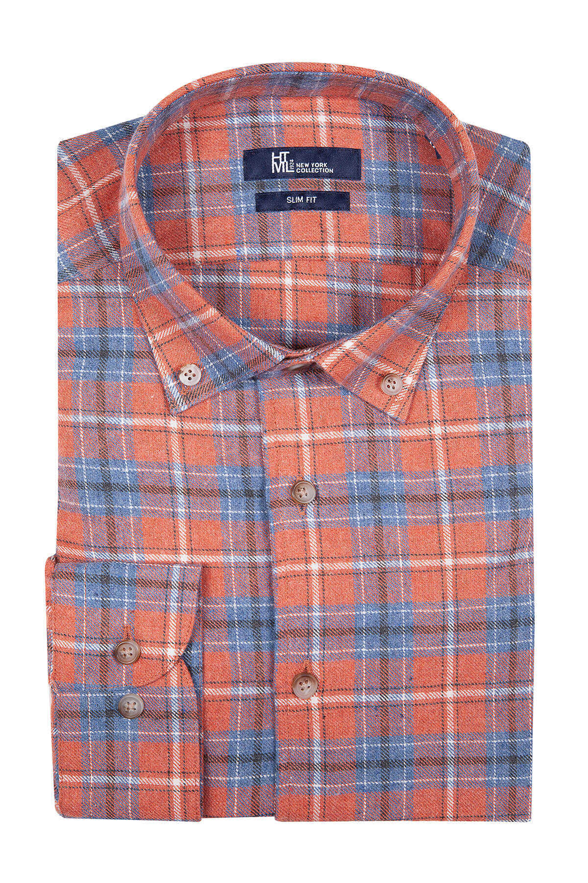 Turuncu Slim Fit Kareli Pamuklu Uzun Kol Gömlek