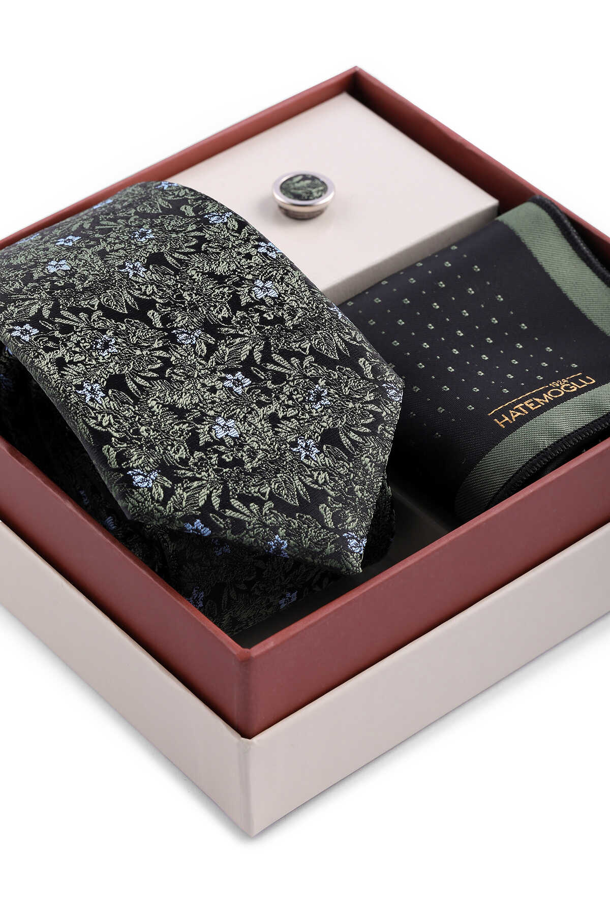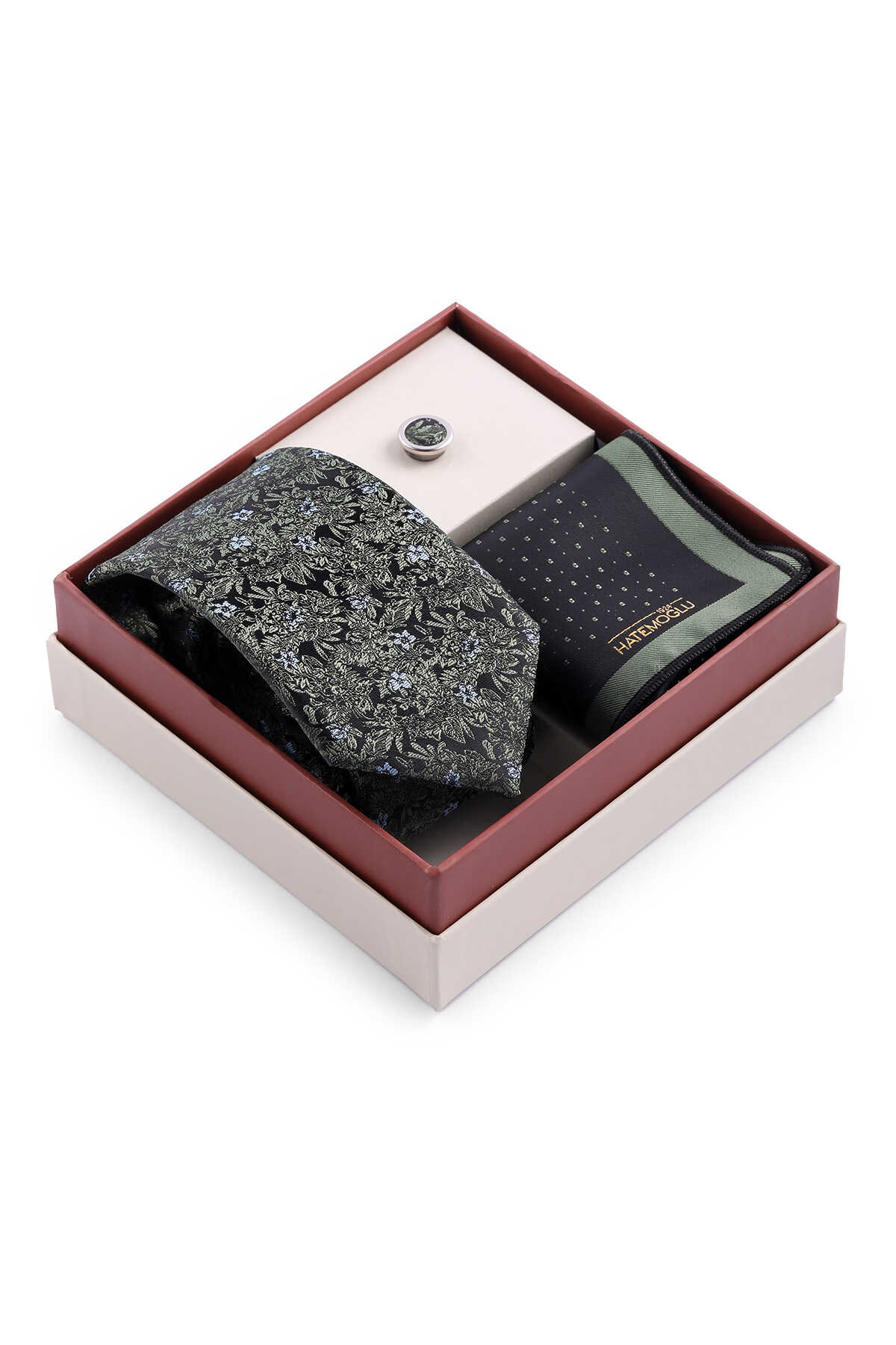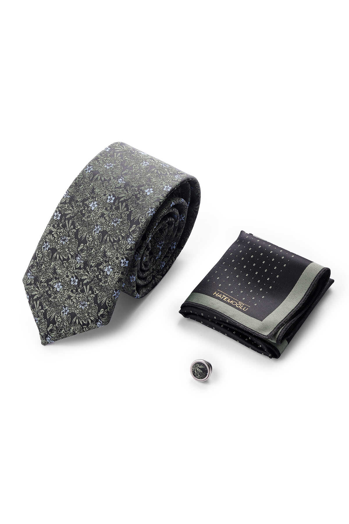 Yeşil Üçlü Yaka Rozeti Kravat Mendil Set
