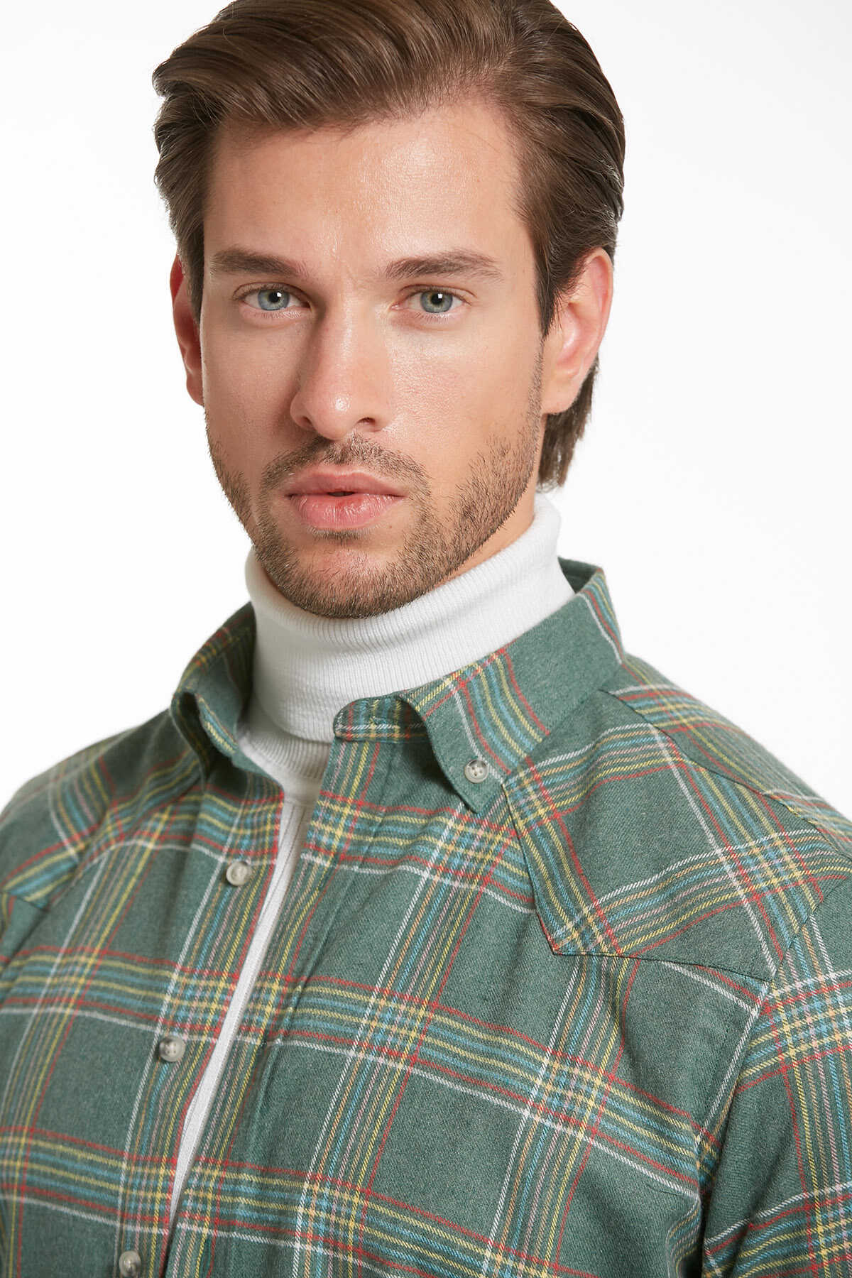 Yeşil Slim Fit Kareli Düğmeli Yaka Uzun Kollu Casual Flanel Gömlek
