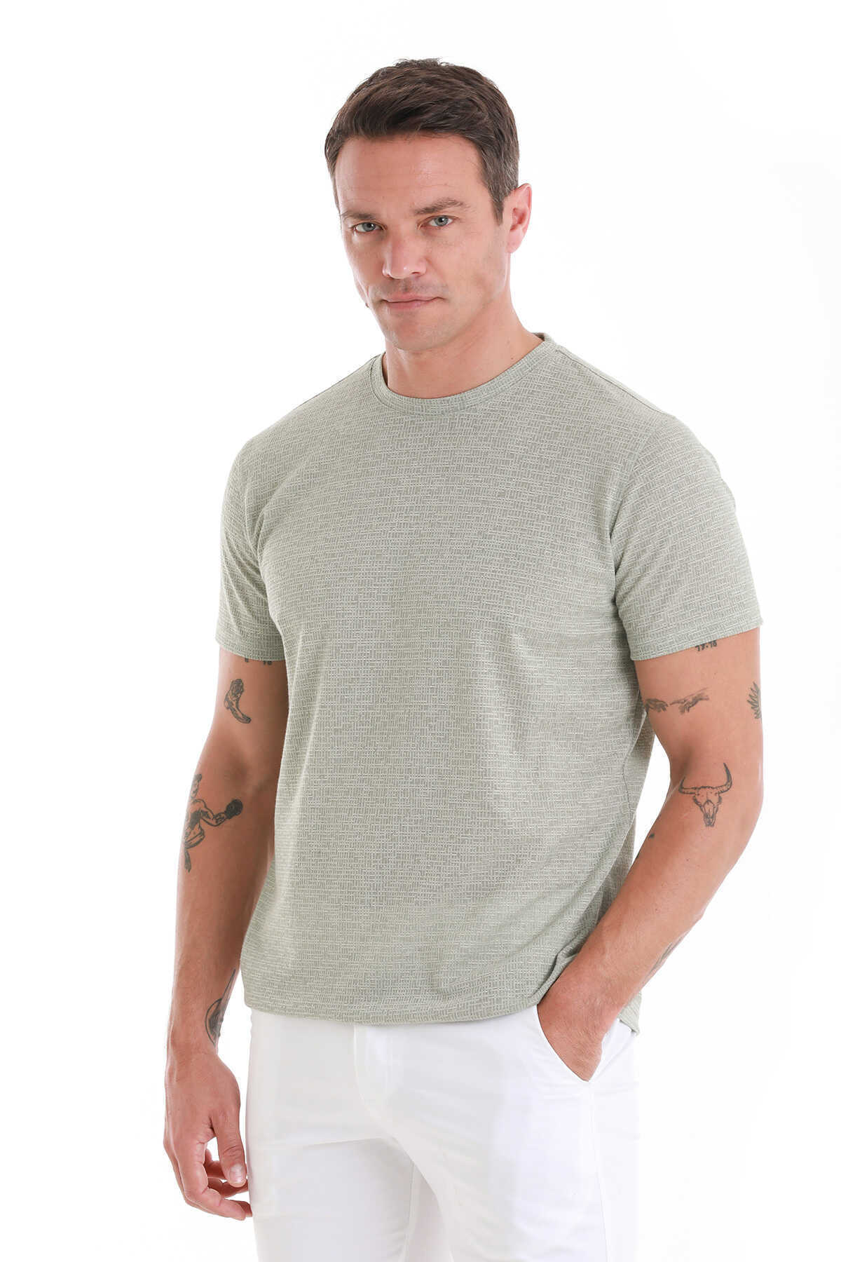 Yeşil Regular Fit Jakarlı Bisiklet Yaka Keten Tişört